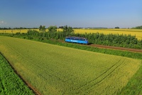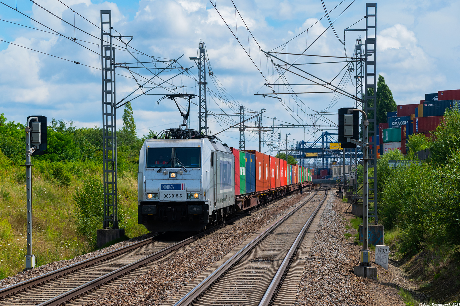 386 018-6 ze skÅ‚adem kontenerów zaraz minie p.o Praha-Hornà MÄ›cholupy na szlaku Praha UhÅ™ÃnÄ›ves - Praha HostivaÅ™ a jednoczeÅ›nie kierujÄ…c siÄ™ dalej na północnÄ… stronÄ™ Czech i dalej na Niemcy. W tle znajduje siÄ™ terminal Metrans.