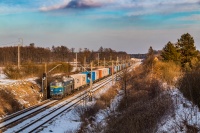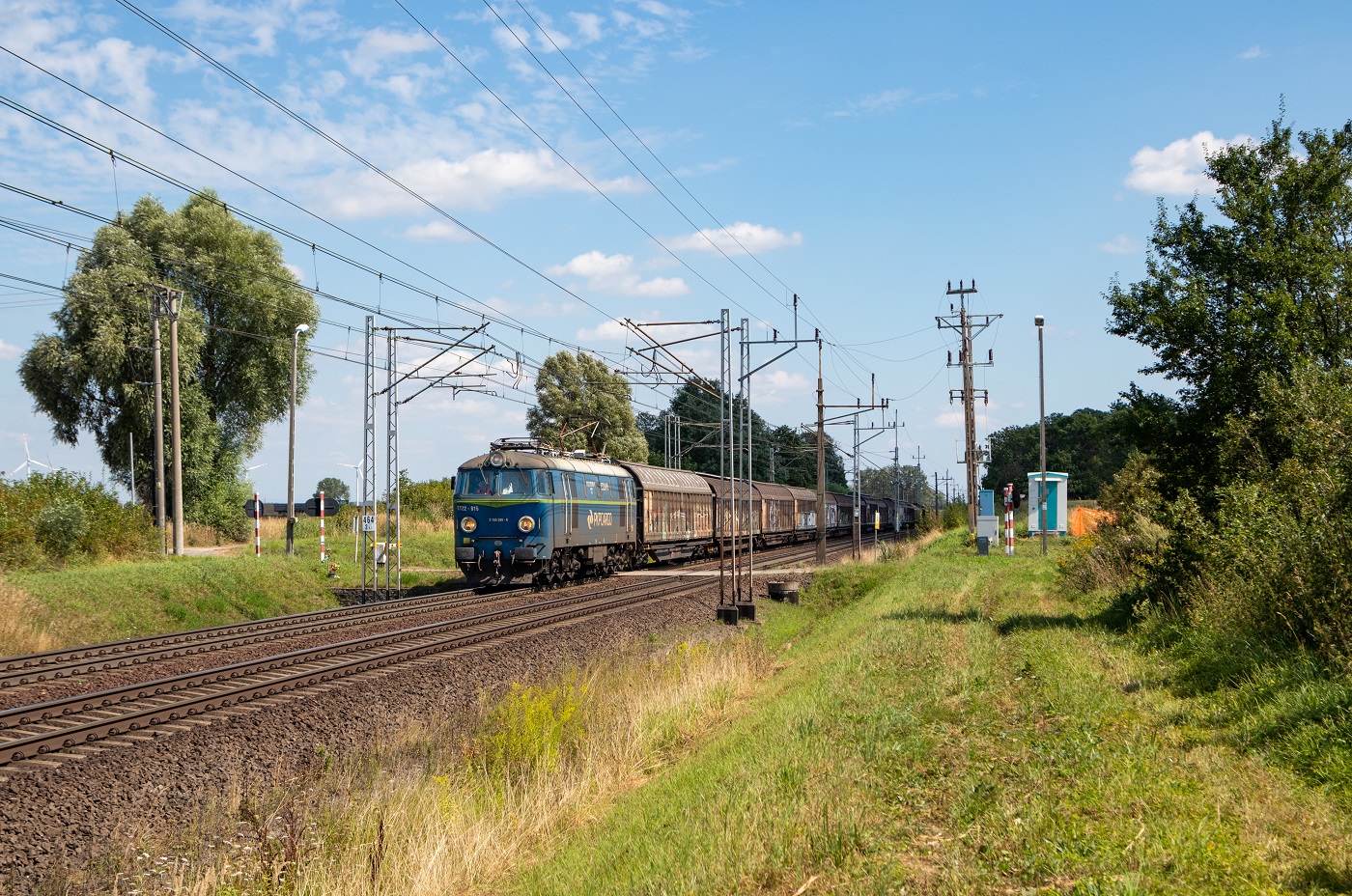 ET22-815 PKP Cargo ze składem wagonów krytych do Oderbrücke mija charakterystyczny przejazd kolejowy w Gajcu. Na zdjęciu można zauważyć ciekawą grę cieni.
