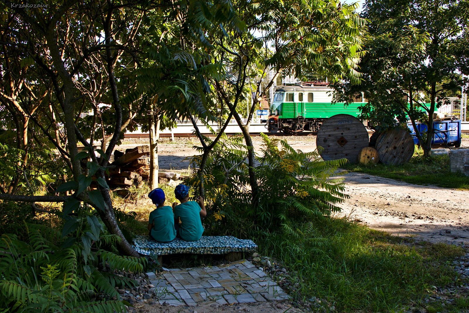 Dzieci zjadają się lizakami i podziwiają piękno przyrody oraz okoliczne maszyny, które barwą niczym kameleon zlały się z otoczeniem.