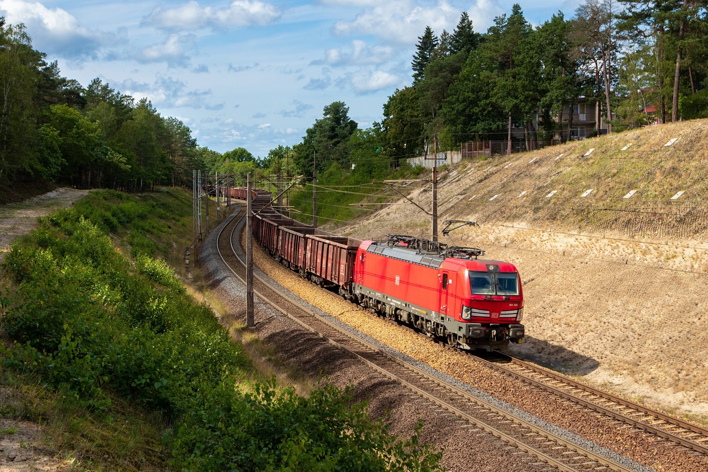 193-385 DB Cargo ze składem węglarek ze Świnoujścia mija łuki w Międzyzdrojach w pogodny dzień. Pomimo niewielkiego obecnie ruchu na "magistrali nadmorskiej", co jakiś czas można tu trafić pociągi chociażby tego przewoźnika. Warto wspomnieć, iż od dłuższego czasu na szlaku Lubiewo - Warnowo ruch odbywa się po jednym torze.