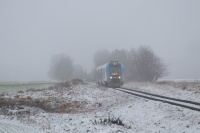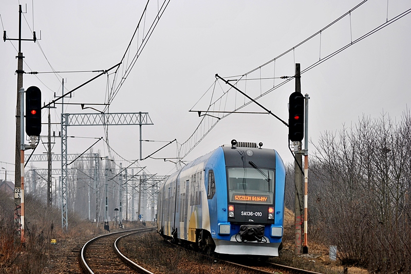 SA136-010 jako poc. spółki Przewozy Regionalne numer 89423 "Drawa" rel. Szczecinek- Szczecin Główny wjeżdża do zamglonego i dżdżystego Stargardu Szczecińskiego.