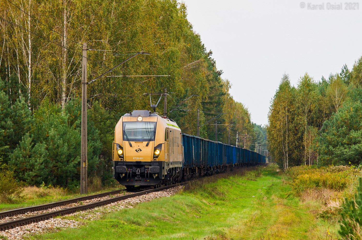 Janików - Sieciechów | Złoty dragon PKP Cargo czyli ET25-001 jedzie ze zwrotem próżnych węglarek ze Świerży Górnych do Jaszczowa.