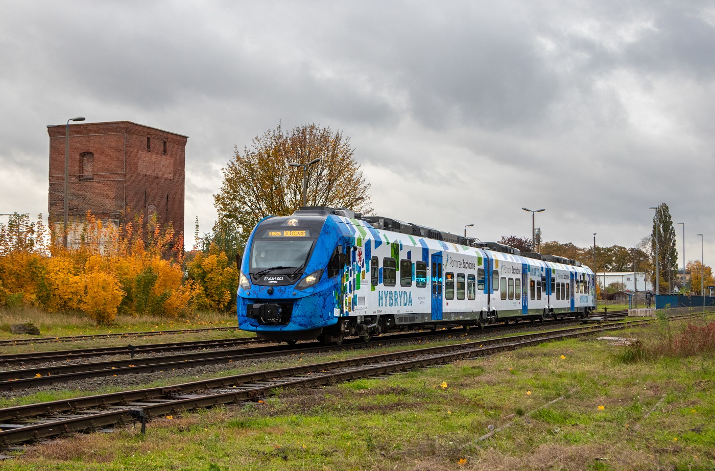 EN63H-003 jako Regio 88626 "Pomerania" relacji Szczecin Główny - Kołobrzeg widziany podczas odjazdu ze stacji Nowogard.