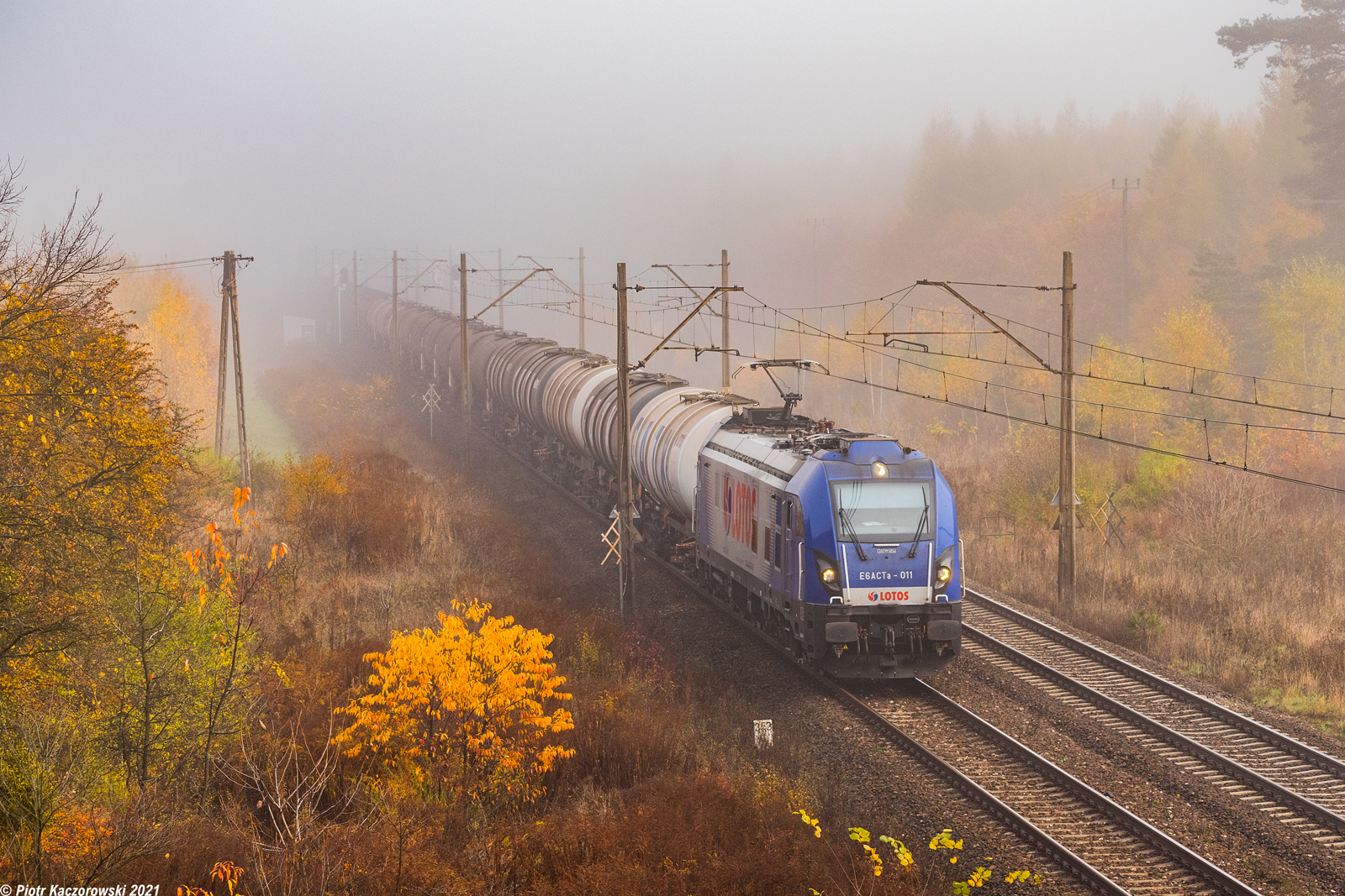 E6ACTa-011 ze składem beczek przemierz szlakiem z Kotomierza w stronę Maksymilianowa i dalej na południe kraju.
