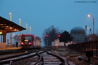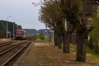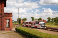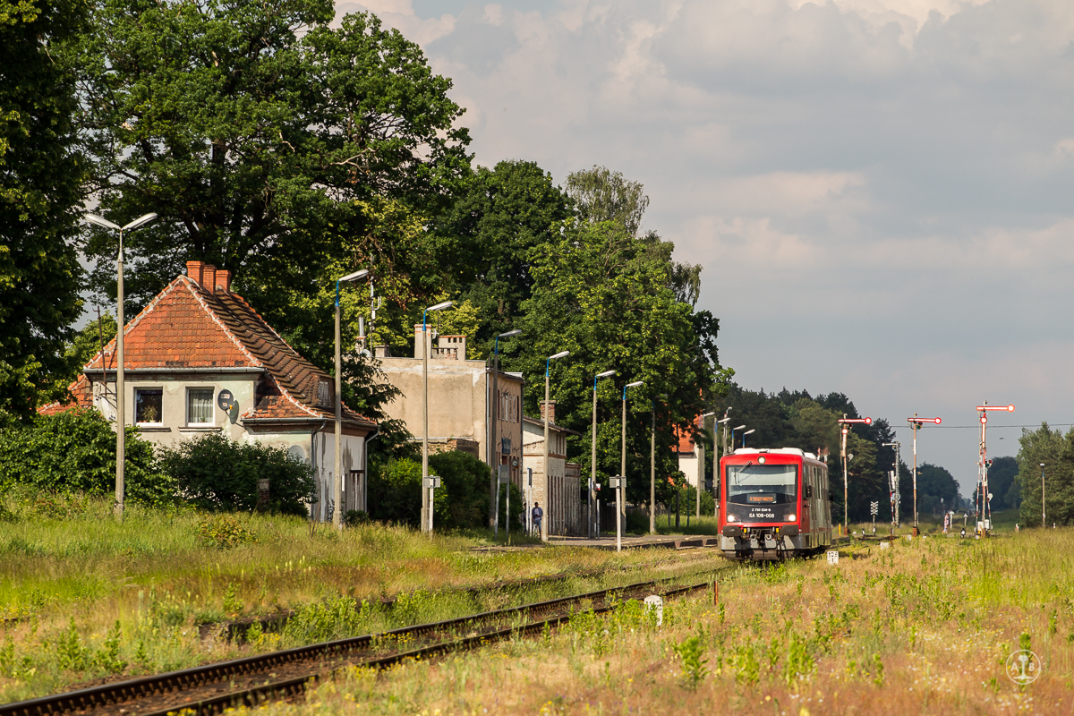 SA 108-008 z pociągiem R58327 rusza ze stacji Wierzchowo Człuchowskie w kierunku Krzyża. W dwudziestoleciu międzywojennym była to ostatnia stacja po stronie niemieckiej i nazywała się Firchau Bahnhof.