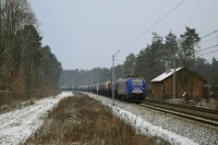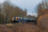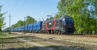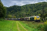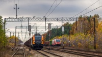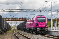 E6ACTab-039 Rail Capital Partners ze składem węglarek z rudą żelaza jedzie w kierunku Rurki. Jest to pociąg przewoźnika PUK Kolprem do Dąbrowy Górniczej Towarowej. Na drzewach widoczne są już oznaki wczesnej jesieni.