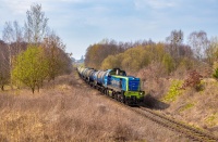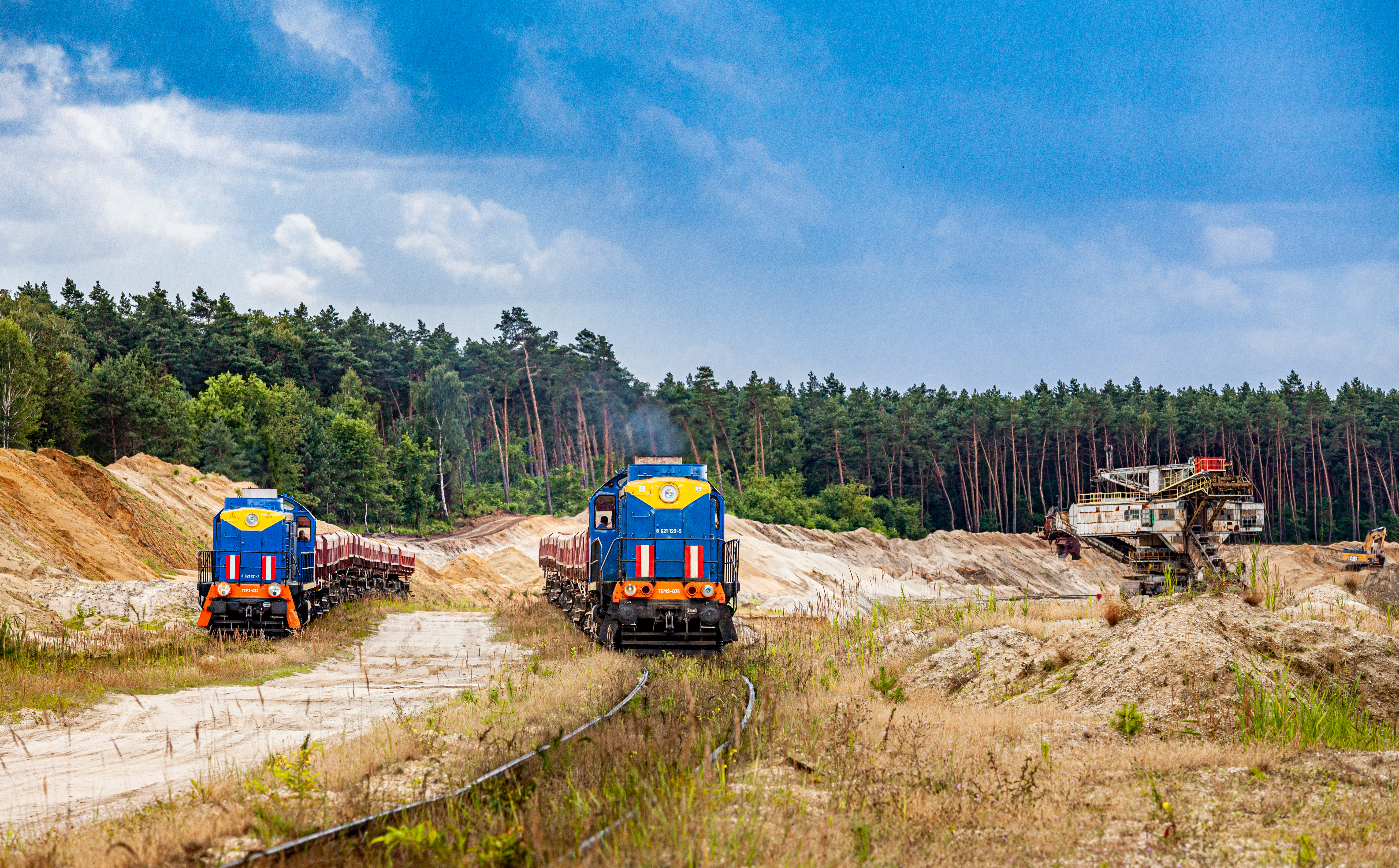 Tamara 052 wyciąga skład ładownych radwanów z pod koparki CAT, natomiast 074 wpycha wagony pod załadunek pod koparkę wielonaczyniową RS-500. Sytuacja jak na obecny stan kolei piaskowej nietypowa, aby dwa składy były naraz na polu piaskowym. Na moje szczęście, chmury zakryły niekorzystne, ostre słońce przez co mogłem wykonać to zdjęcie bez zbędnej, agresywnej post-produkcji.