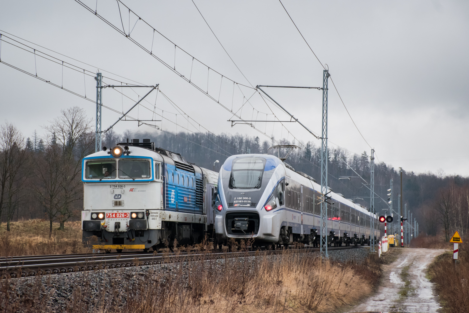 Nurek 026-3 z pociągiem TLK "Sudety" mija się z ED161-011 z IC "Orzeszkowa". Scena nie do powtórzenia, gdyż zamiast 754 jeździ SZT SKPL, zaś "Orzeszkowa" kursuje już jako TLK na wagonach. Sporo szczęścia miałem robiąc to zdjęcie :)