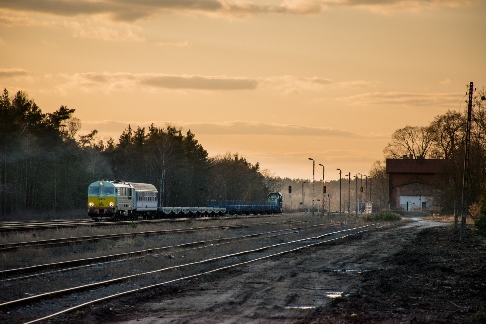 SU46-047 z wagonem PKP IC oczekuje na odjazd do Legnicy. Jest to zwrot po eszelonie jaki tamtego dnia przyprowadziła Suka do Leszna Górnego(Pstrąża). Druga część składu to platformy po maszynach wojskowych, które widoczny Kiosk zaprowadzi do Żagania