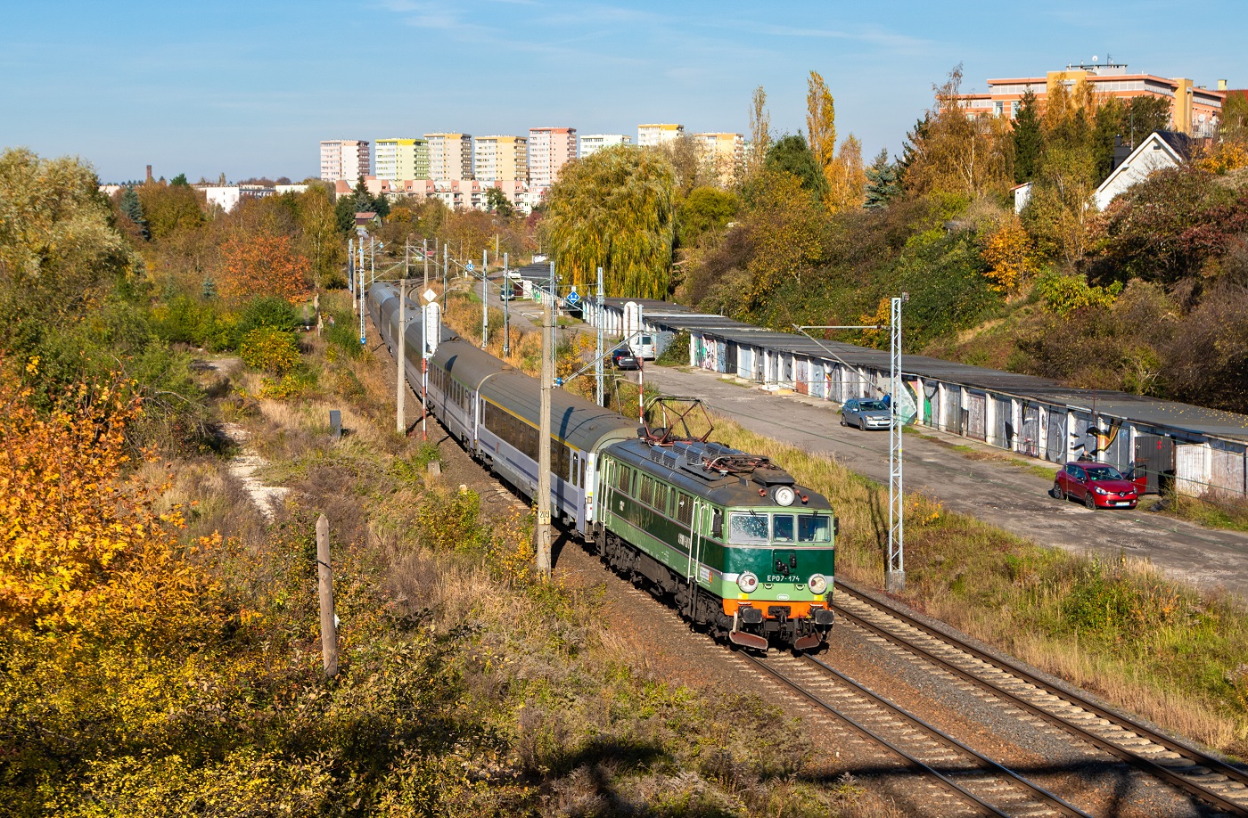 EP07-174 z IC 3802 "Chełmoński" relacji Kraków Główny - Świnoujście w pięknej, jesiennej aurze mija posterunek odgałęźny Szczecin Wstowo. W tle widać bloki mieszkalne na szczecińskich Pomorzanach.