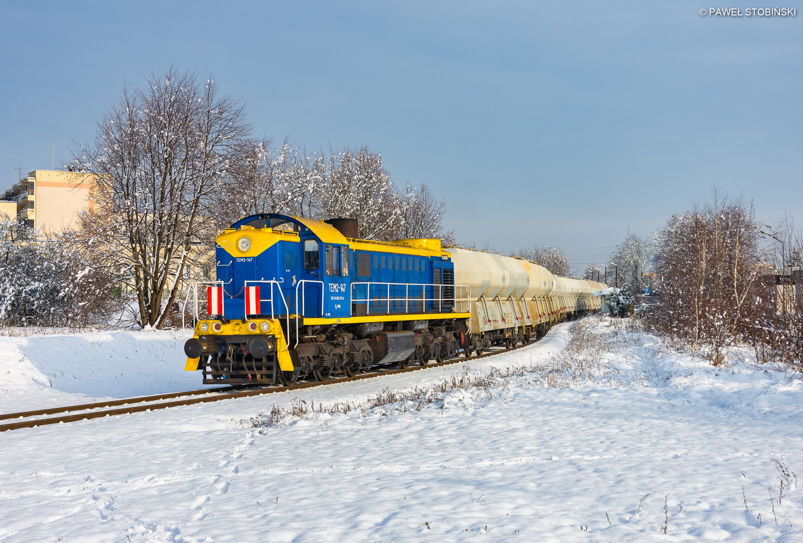TEM2-147 ze składem gruszek z Elektrowni Pątnów w słoneczne zimowe południe wjeżdża do Konina.