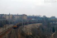 Kołomna z pociągiem towarowym nr 664056 rel. Wróblin Głogowski - Pawłowice Małe minęła przed chwilą stację w Grębocicach jadąc w pochmurne i mroźne przedpołudnie szlakiem Grębocice - Rudna Gwizdanów w stronę Lubina. W tle przejazd na ul. Legnickiej oraz semafory wjazdowe od strony Rudnej Gwizdanów.