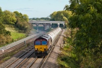 66619 spółki Freightliner z pociągiem towarowym mija miejscowość Souldrop, zmierzając linią East Midlands w stronę Wellingborough.