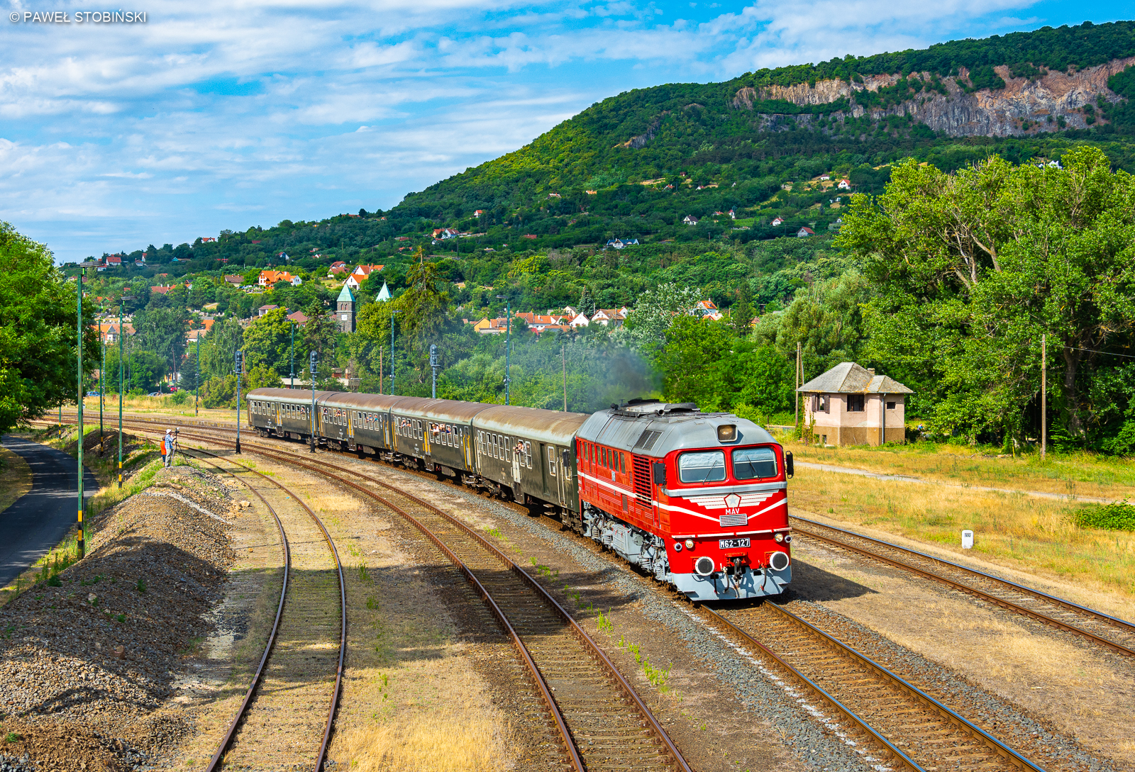 M62-127 z pociągiem osobowym rel. Tapolca - Balatonfüred rusza ze stacji Badacsonytomaj. Jak widać u naszych bratanków "da się" zorganizować retro weekend z prawdziwego zdarzenia, zastępując niemal wszystkie pociągi nad węgierskim morzem klasycznymi dieslami. Pociągów i lokomotyw jest tak dużo, że głowa boli - z bólem serca trzeba wybierać które składy gonić, a które odpuszczać ;) Warto dodać, że Gagar został odmalowany w historyczne barwy niemal dokładnie rok wcześniej. Wtedy w drodze powrotnej znad Balatonu udało nam się go złapać podczas premierowej jazdy z towarem w Záhonach ;)