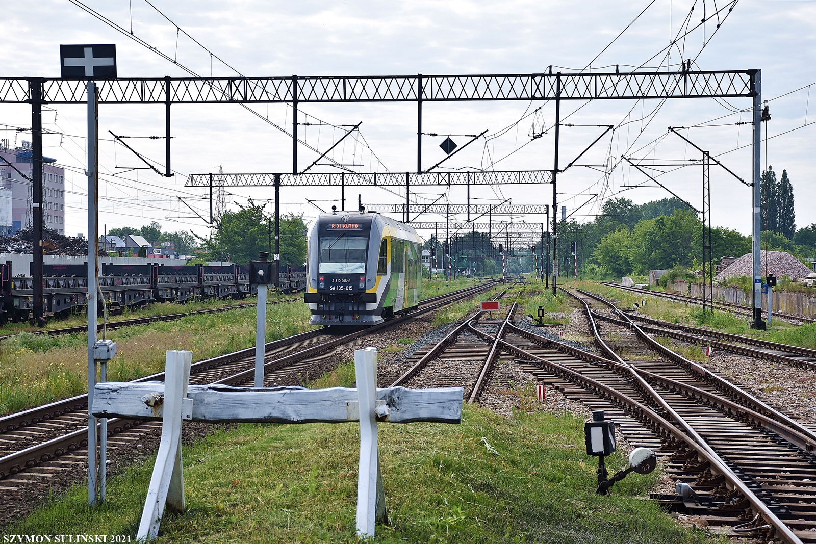 Autobus szynowy SA135-015 należący do spółki Koleje Mazowieckie po planowym postoju wyjeżdża ze stacji Płock, pociąg osobowy 51344 relacji Sierpc - Kutno.