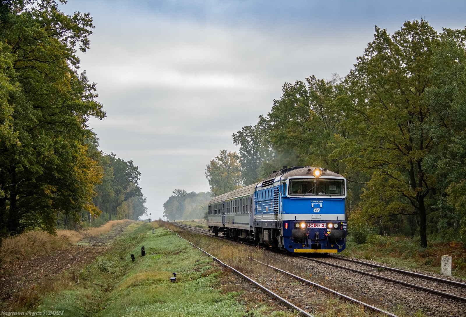 Nurek 754 028-9 na czele pociągu TLK 36102 "Sudety" relacji Kraków Główny - Jelenia Góra, w ponury jesienny poranek zwalnia do 40-ki przed semaforem wjazdowym odnoszącym się do miejscowej stacji, którą pokona na biegu. // https://www.youtube.com/watch?v=3Sm6LXw2PaY&t=398s