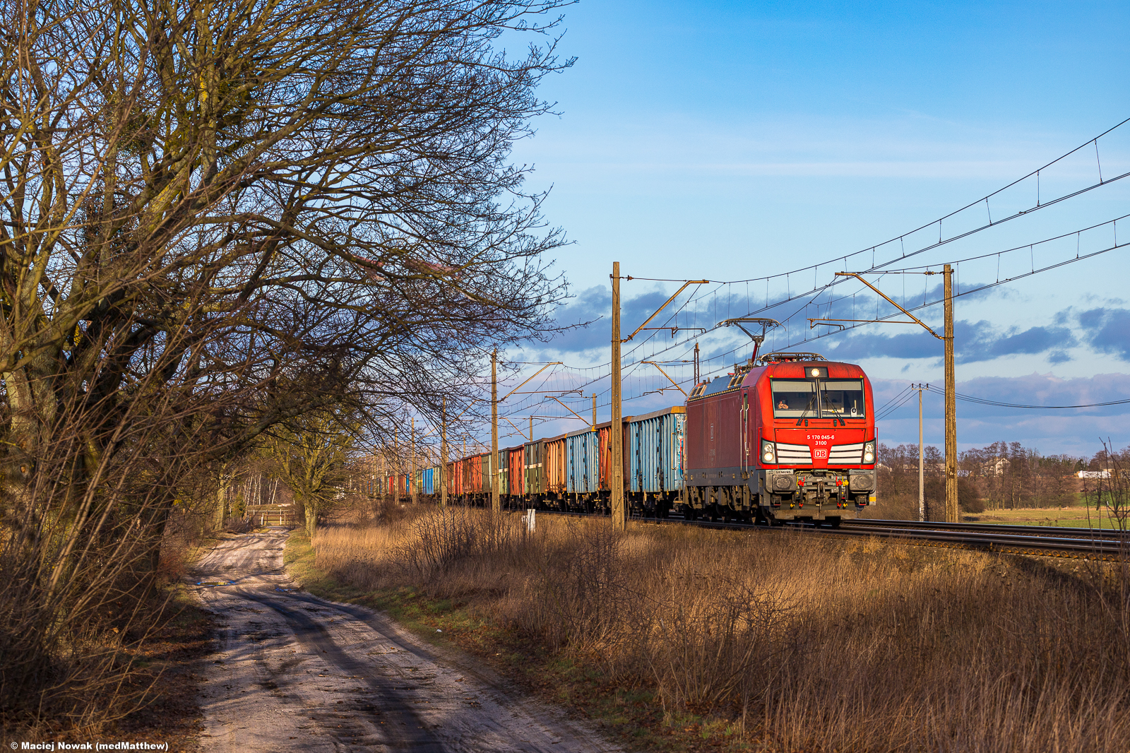 Vectron DB ze składem 40-stu kolorowych węglarek, podąża szlakiem Kotomierz - Maksymilianowo, na około godzinę przed zachodem słońca.