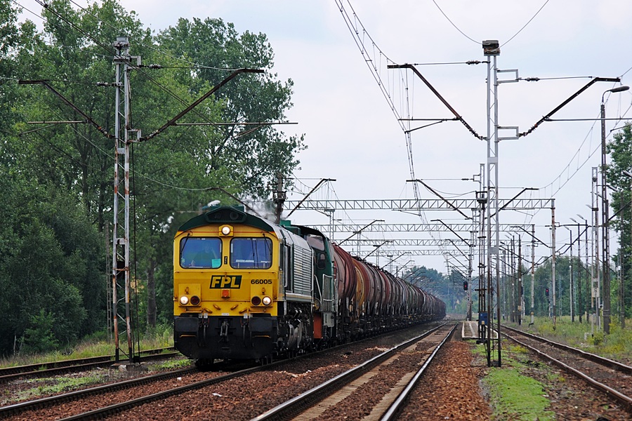 Class66 #66005 należący do FPL oraz SM42-2600 należąca do Lotos Kolej wraz ze składem beczek Lotosu jedzie w stronę podg. Retkinia.