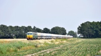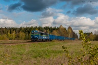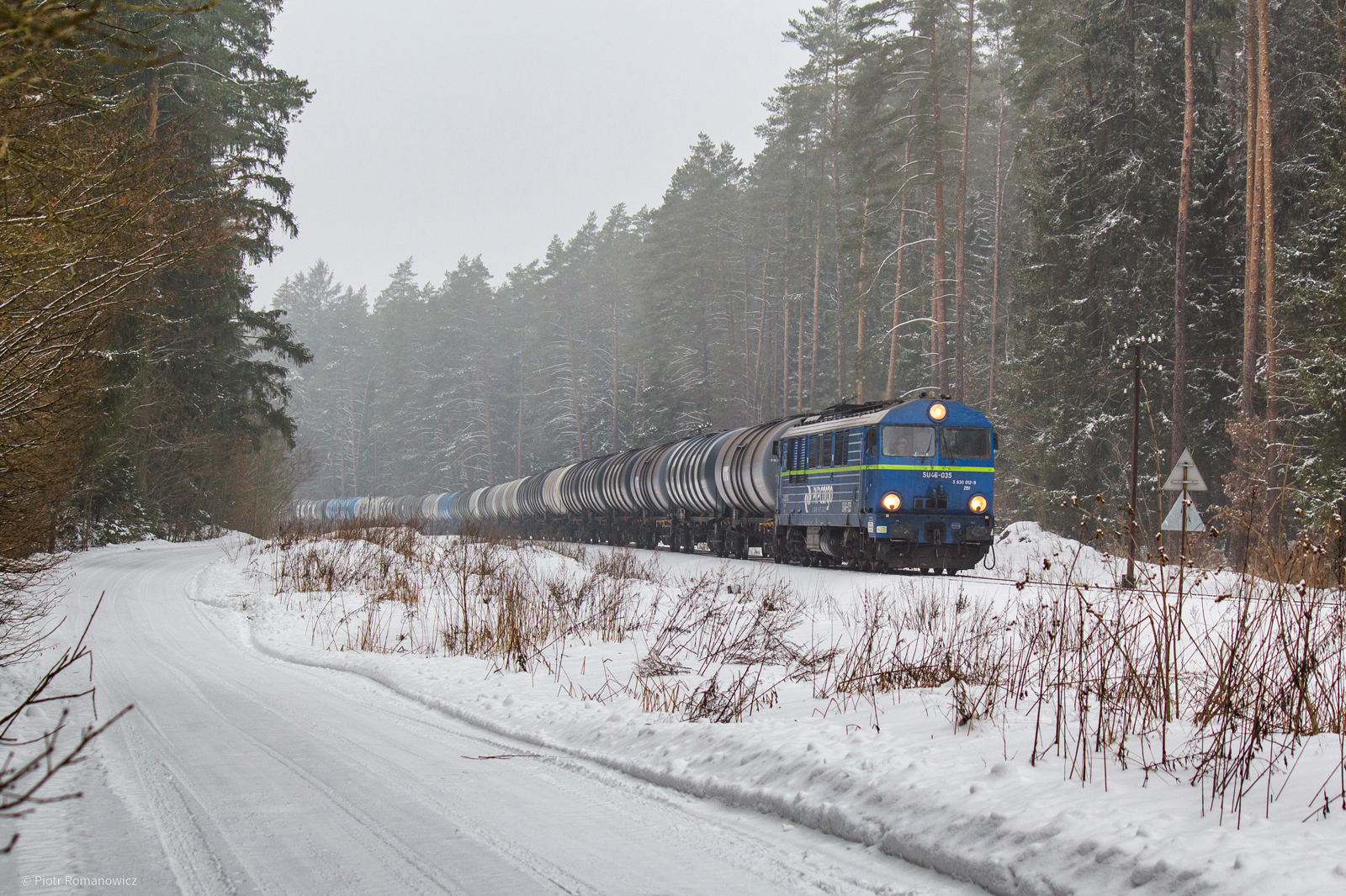 SU46-035 ze składem beczek relacji Płock Trzepowo - Mockava mija odcinek leśny linii kolejowej nr 39 w okolicach wsi Ogrodniki i zbliża się do nieczynnej od kilkunastu lat stacji Raczki, która jednocześnie była przedwojenną stacją graniczną po stronie Polskiej.