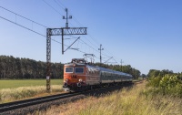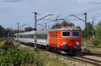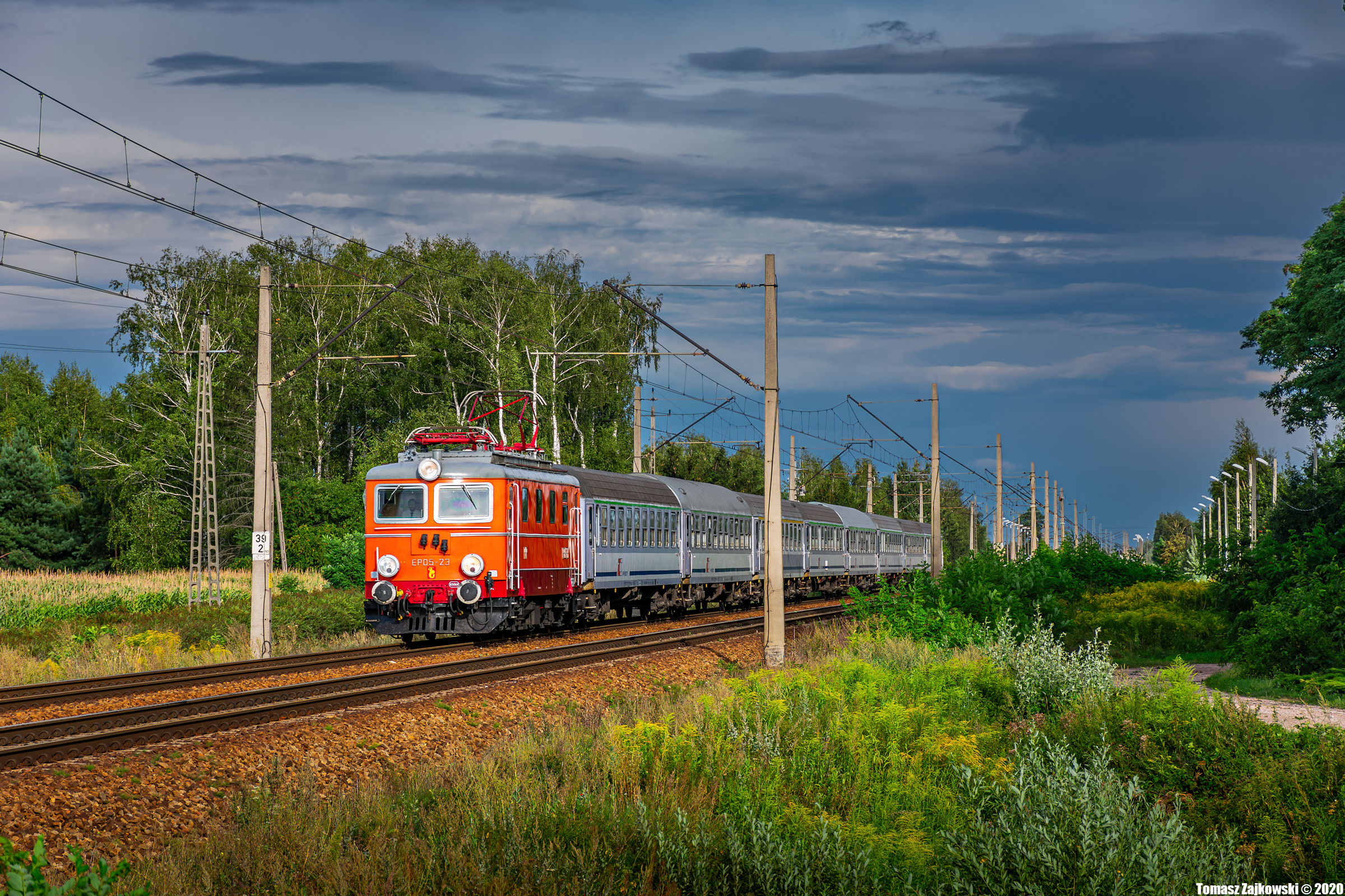EP05-23 na czele pociągu TLK "Warta" z Warszawy Wschodniej do Poznania Głównego, mknie szlakiem Błonie - Teresin Niepokalanów.