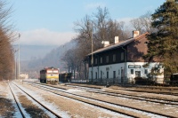 Na drugim planie natomiast pociąg REX 1907 relacji Košice - Michalovce po normalnym torze zbliża się do przystanku Vyšná Myšľa, który minie na biegu. Skład prowadzi nurek 757 004.