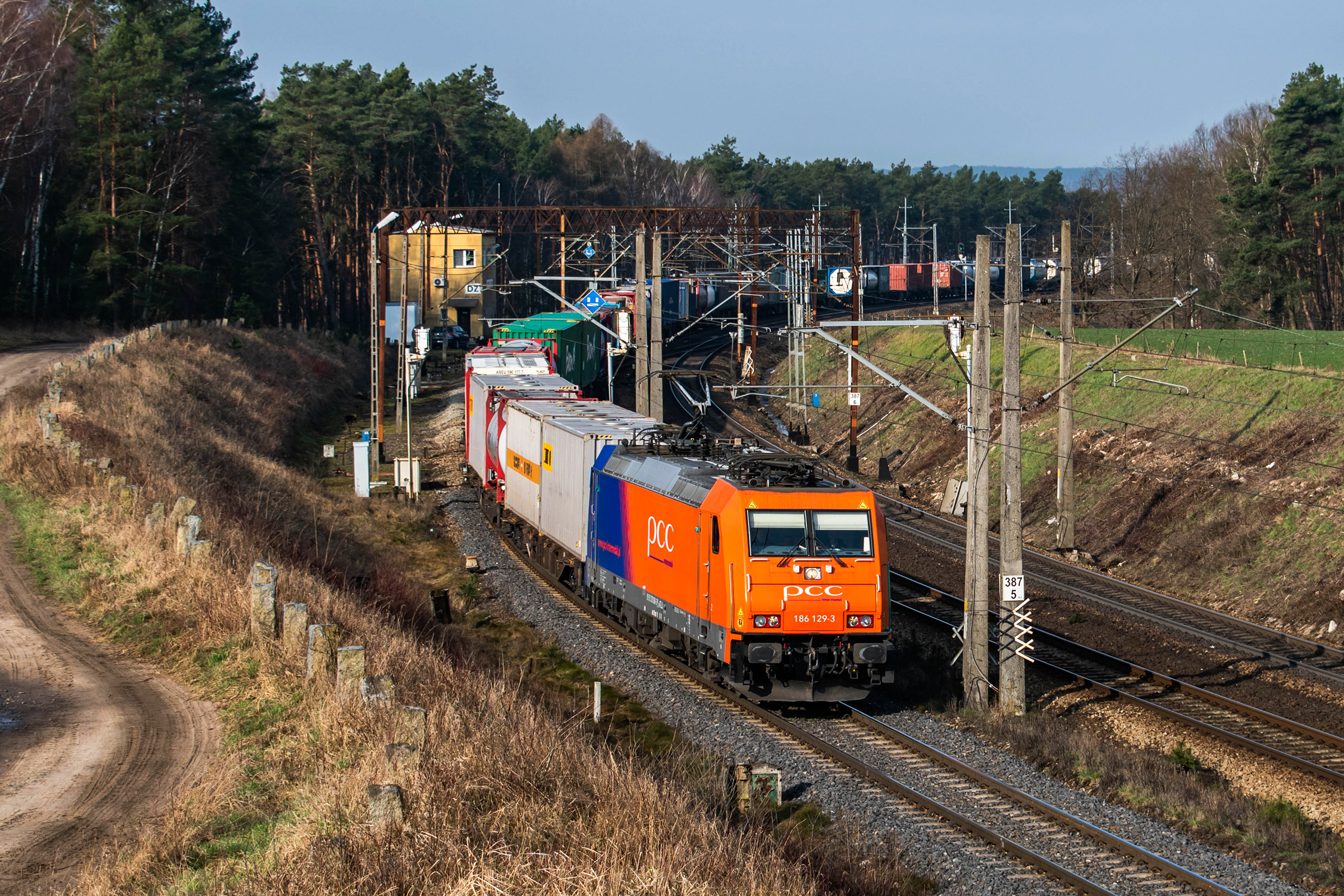 Traxx 186 129 zjeżdża z E20 mijając przy tym p.odg Dąbrówka Zbąska, w kierunku Chlastawy, wraz z pociągiem 712013 do Starej Wsi k. Kutna.