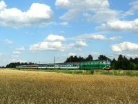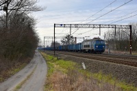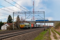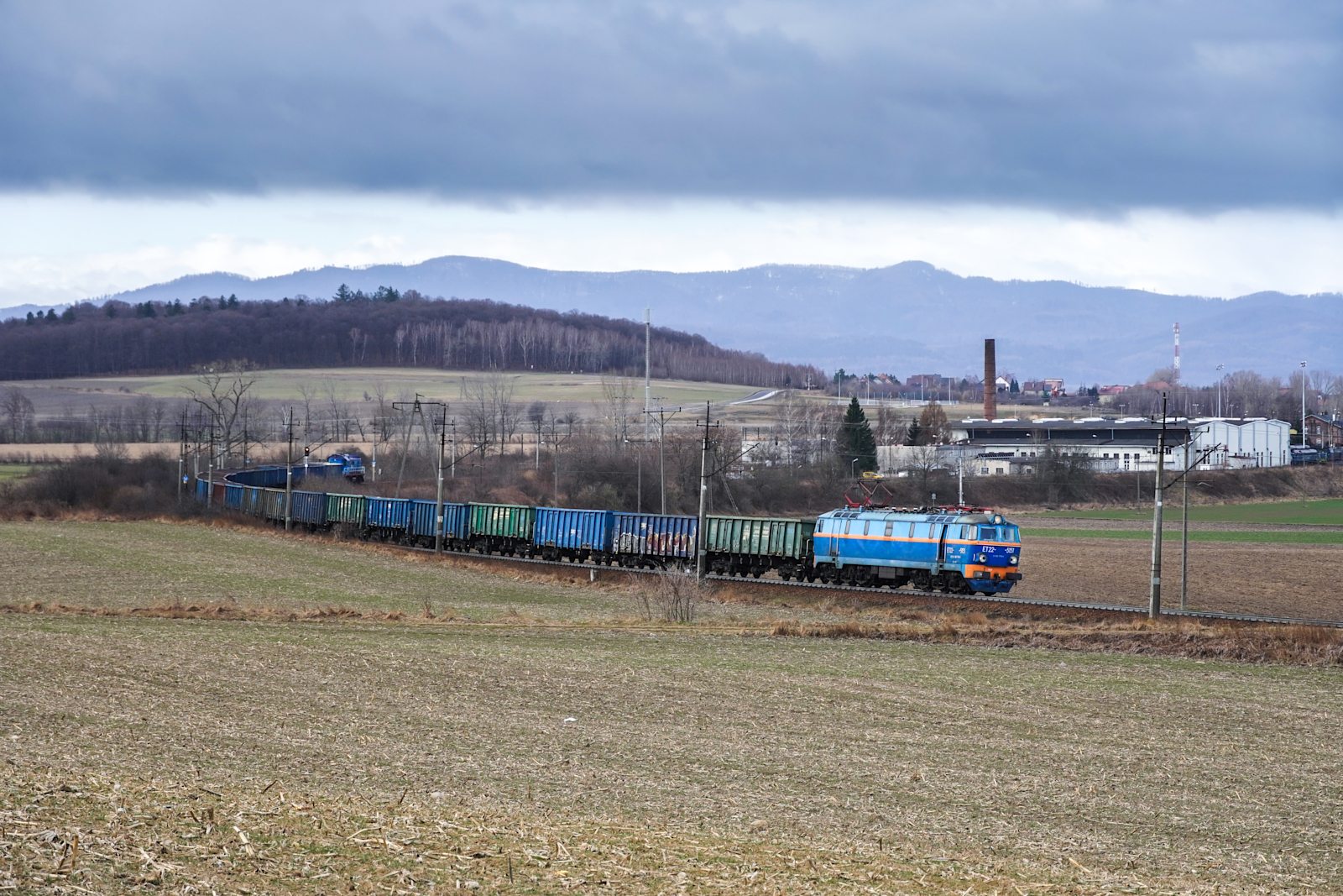 ET22-5151 ze składem węglarek i TEM2-035 na popychu pokonuje strome wzniesienie na szlaku Kamieniec Ząbkowicki – Starczów. Wagony zostały załadowane kruszywem w kopalni Pomianów-Doboszowice.
