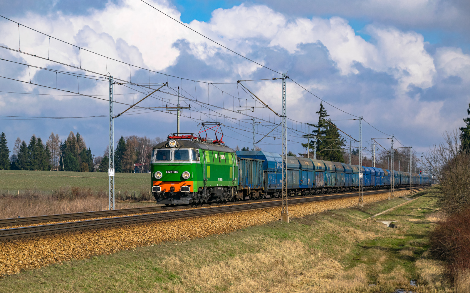 ET22-980 z talbotami i aż jedną węglarką jedzie linią kolejową numer 1 tzw. "Wiedenka" i szlakiem Rogów-Koluszki.