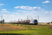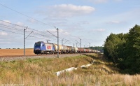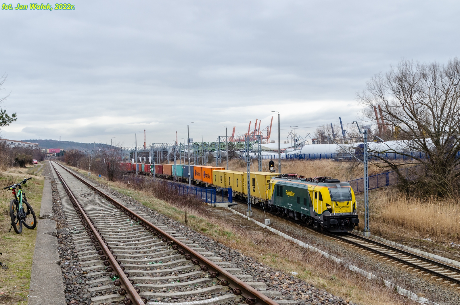 E6ACTd-103 wpycha kontenery na stację GPK położoną na bocznicy Bałtycki Terminal Kontenerowy. W tle widać suwnice nabrzeżowe znajdujące się na terenie BCT Bałtycki Terminal Kontenerowy, oraz dwie które są na terenie GCT Gdyński Terminal Kontenerowy.