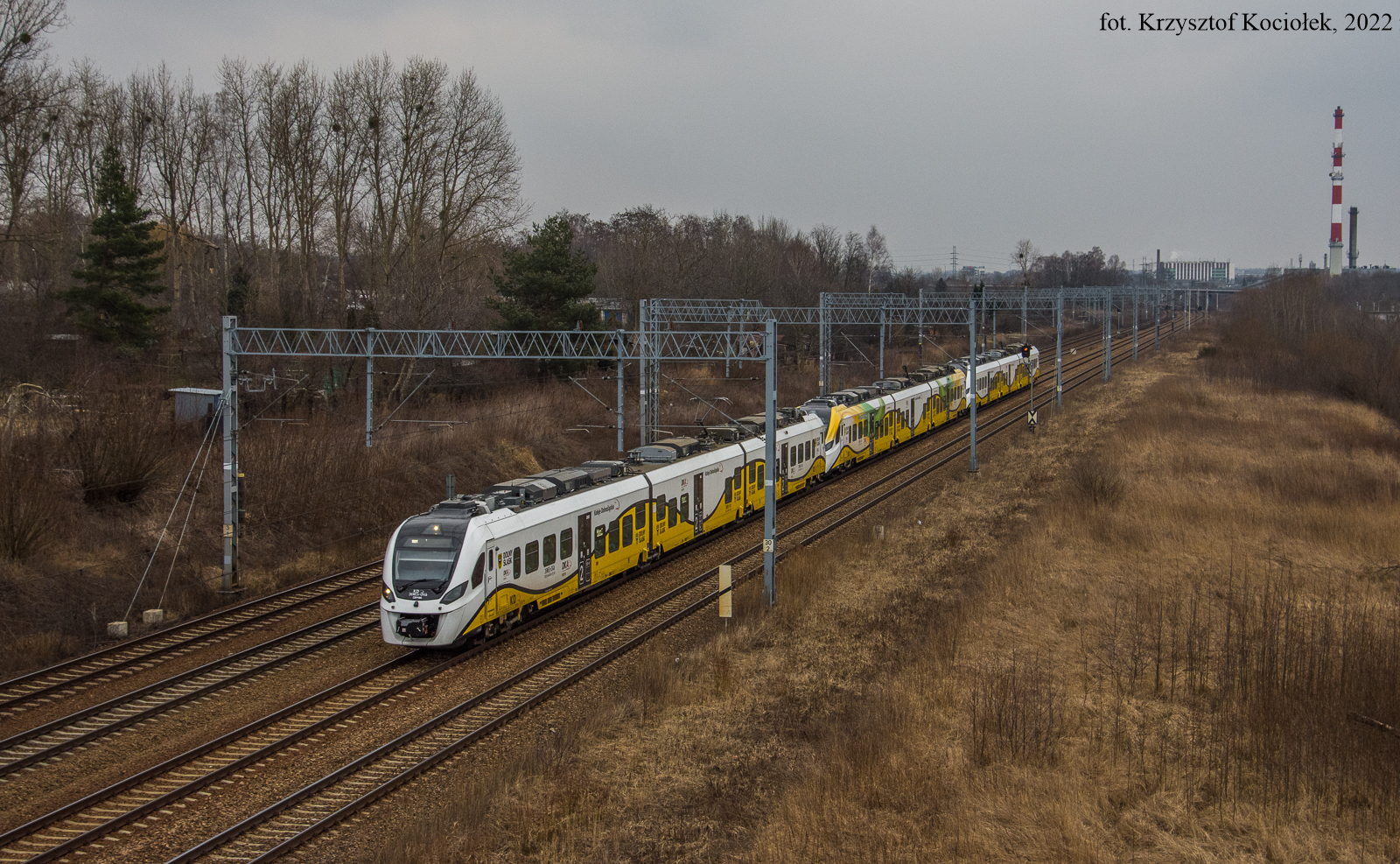 36WEh-014 + 36WEh-012 + 36WEh-013 jako pociąg humanitarny nr 36100 U-KD relacji Przemyśl Główny - Wrocław na szlaku podg. Szobiszowice - Gliwice Łabędy zmierza w kierunku Dolnego Śląska. W normalnych czasach spotkanie takiego składu KD w takim miejscu (z dala od macierzy Kolei Dolnośląskich) byłoby raczej niemożliwe, więc fotografia ma bardziej charakter dokumentacyjny.