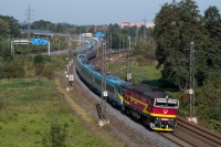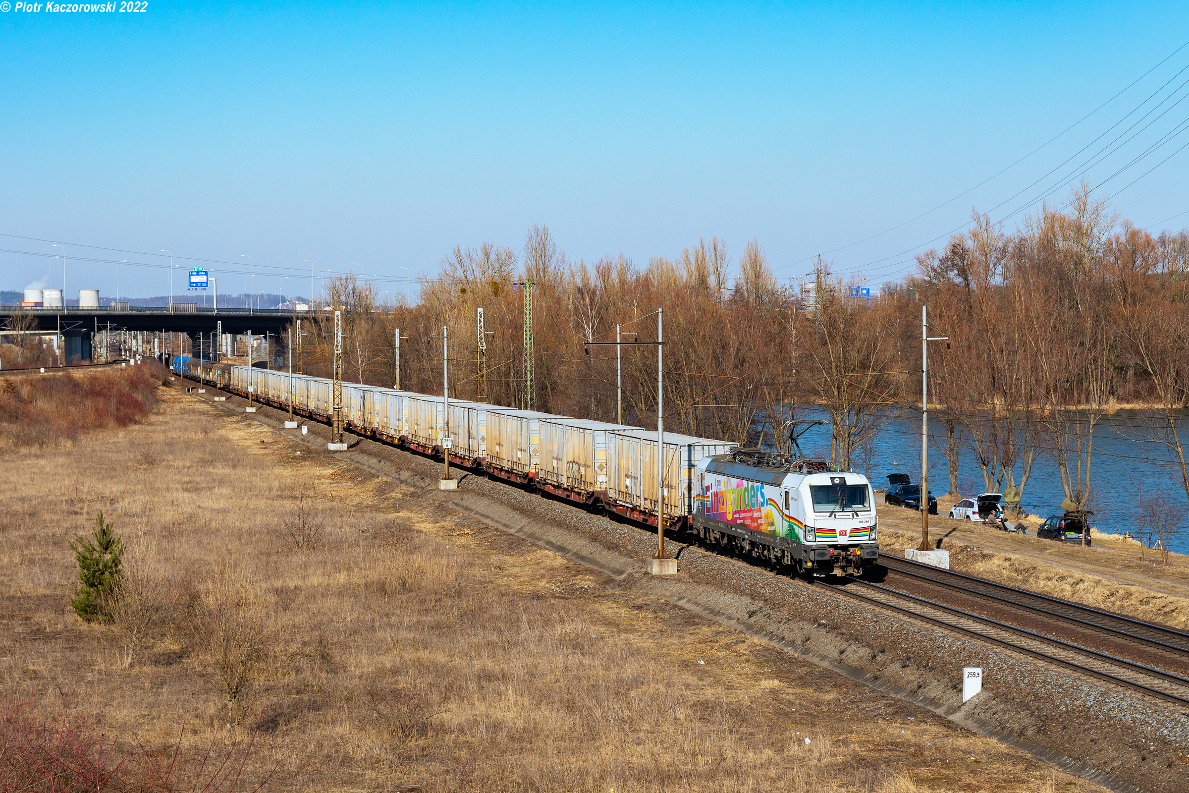 193 366 w okleinie "I am Einziganders" z pociągiem towarowym jako Nex 55534 rel. Ostrava pravé nádražà - Halle (Saale) Gbf Nord opuszcza Ostrave na szlaku Ostrava Svinov - Polanka nad Odrou. Po lewej stronie widoczna jest D1 (Dálnice D1 odpowiednik po polsku autostrada) i wieże chłodnicze należące do Veolia Energie ČR, a.s.