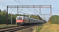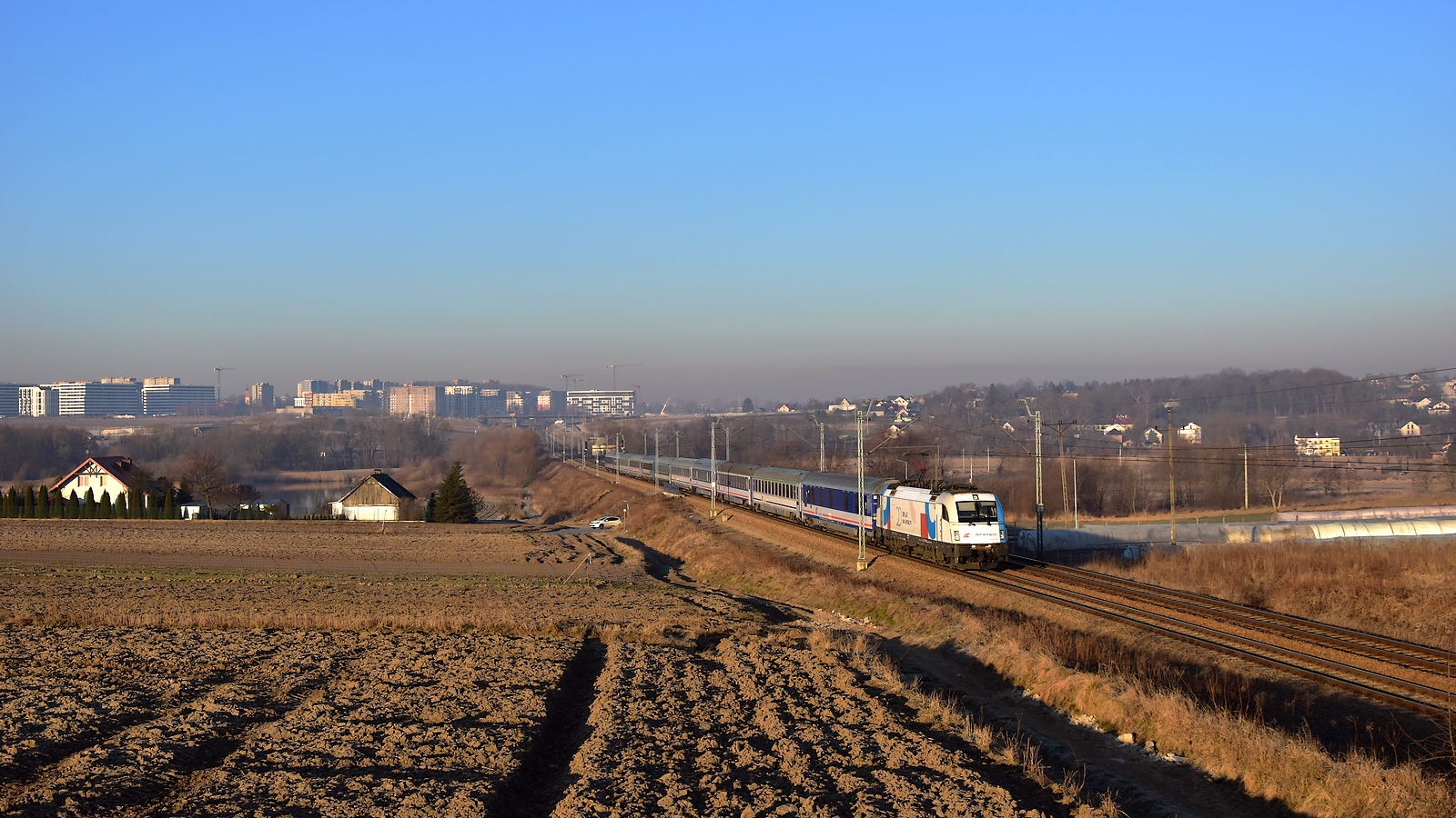 EU44-006 - w okleinie okolicznościowej (20 lat PKP IC) - ciągnie skład pociągu międzynarodowego IC406 Chopin, z Grazu/Budapesztu/Pragi do Warszawy Wschodniej, mijajac właśnie podkrakowskie Raciborowice.