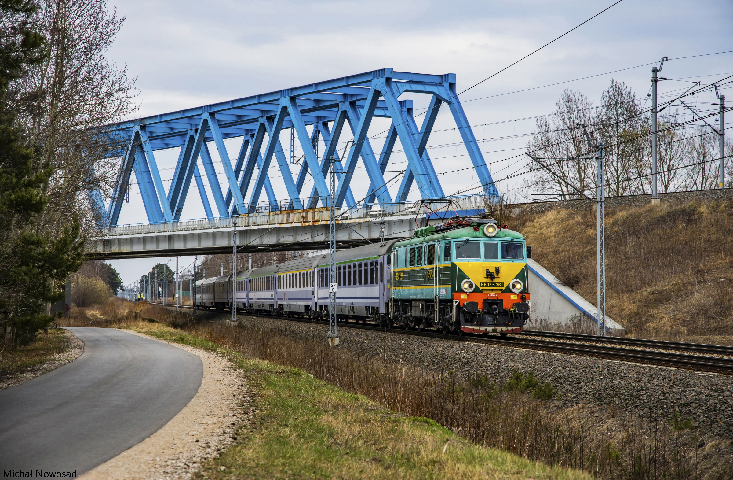 EP07-361 ze składem IC 16105 "Nałkowska" relacji: Białystok - Wrocław Główny mija wiadukt CKM-ki jadąc szlakiem: Grodzisk Mazowiecki - Żyrardów.