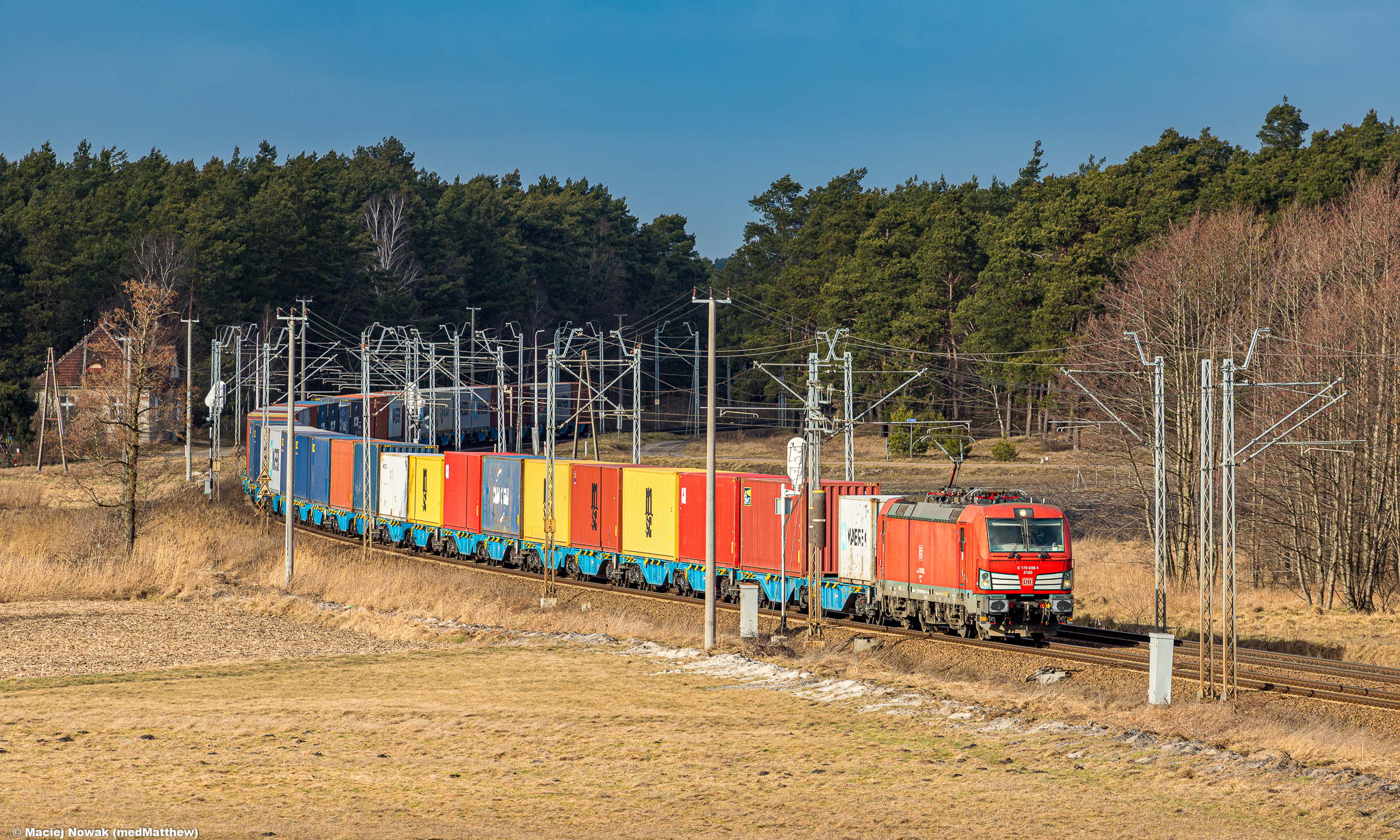 X4EC-038 ze składem 44-ech kontenerów zbliża się do stacji Nowa Wieś Wielka, jadąc od strony Bydgoszczy, nad którą przeszły deszczowe chmury.