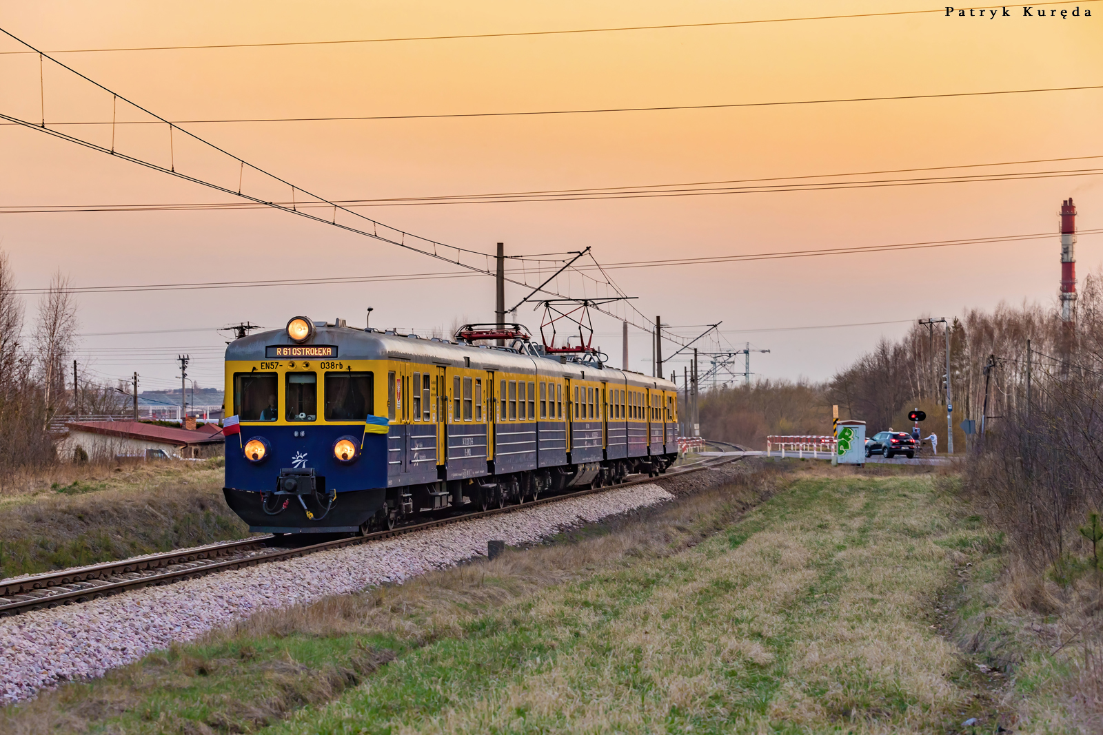 EN57-038 jako podwieczorny osobowy z Tłuszcza do Ostrołęki opuszcza Wyszków w kierunku Przetyczy. Był to wyjątkowo ciepły i malowniczy kwietniowy wieczór.