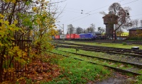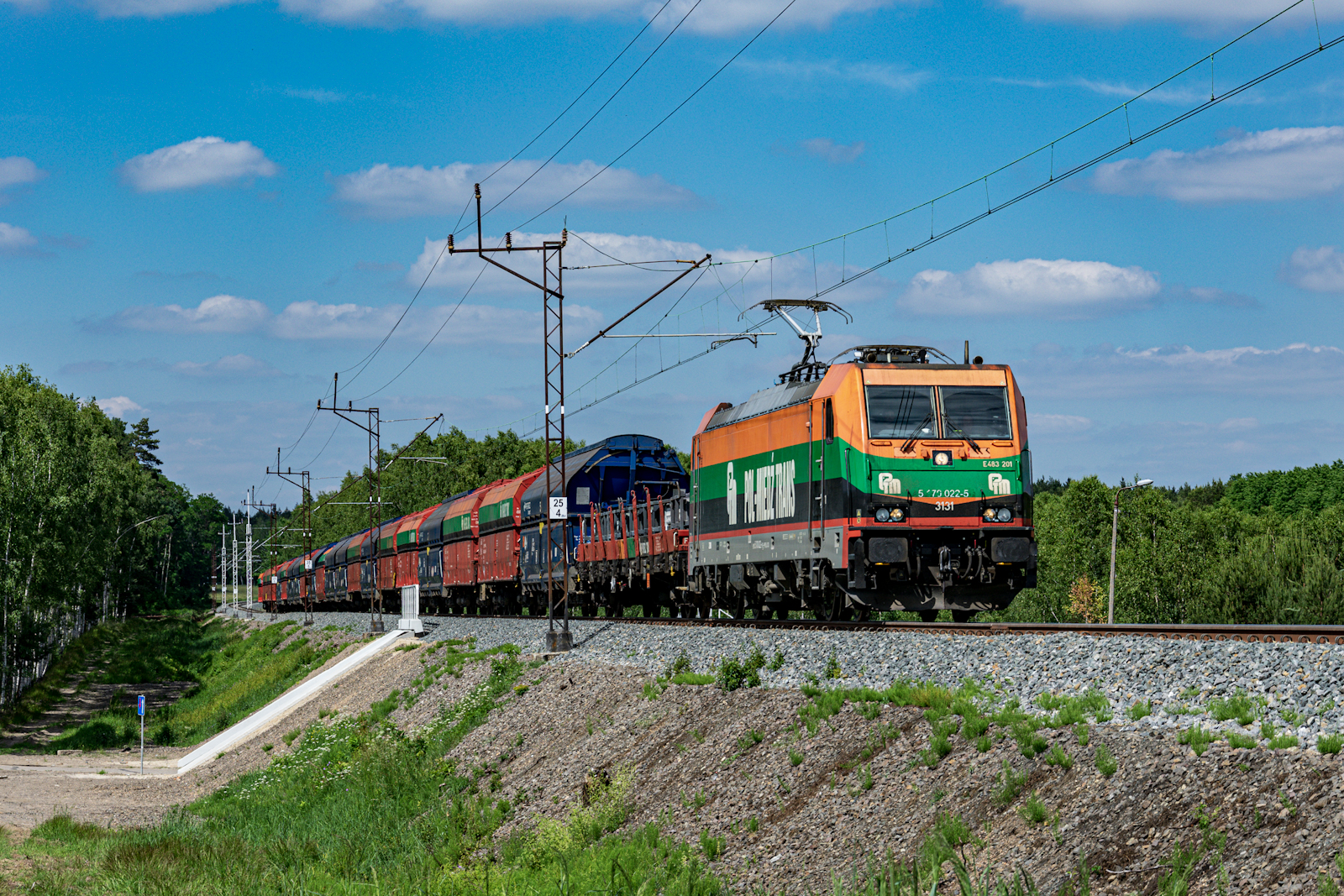 Traxx z pociągiem towarowym nr 664024 rel. Wróblin Głogowski - Lubin KGHM mija przepust nad drogą do miejscowego lotniska jadąc w pogodne popołudnie szlakiem Koźlice - Lubin w stronę lubińskiej stacji, gdzie po oblocie uda się do stacji docelowej.
