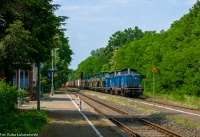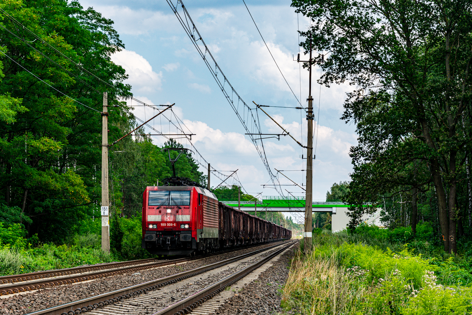 Eurosprinter z pociągiem towarowym nr 274007 rel. Rykoszyn - Ziltendorf EKO mija okoliczne lasy w grodzie Bahusa jadąc w pogodne, późne popołudnie odstępem Zielona Góra Stary Kisielin - Zielona Góra Główna w stronę Czerwieńska.