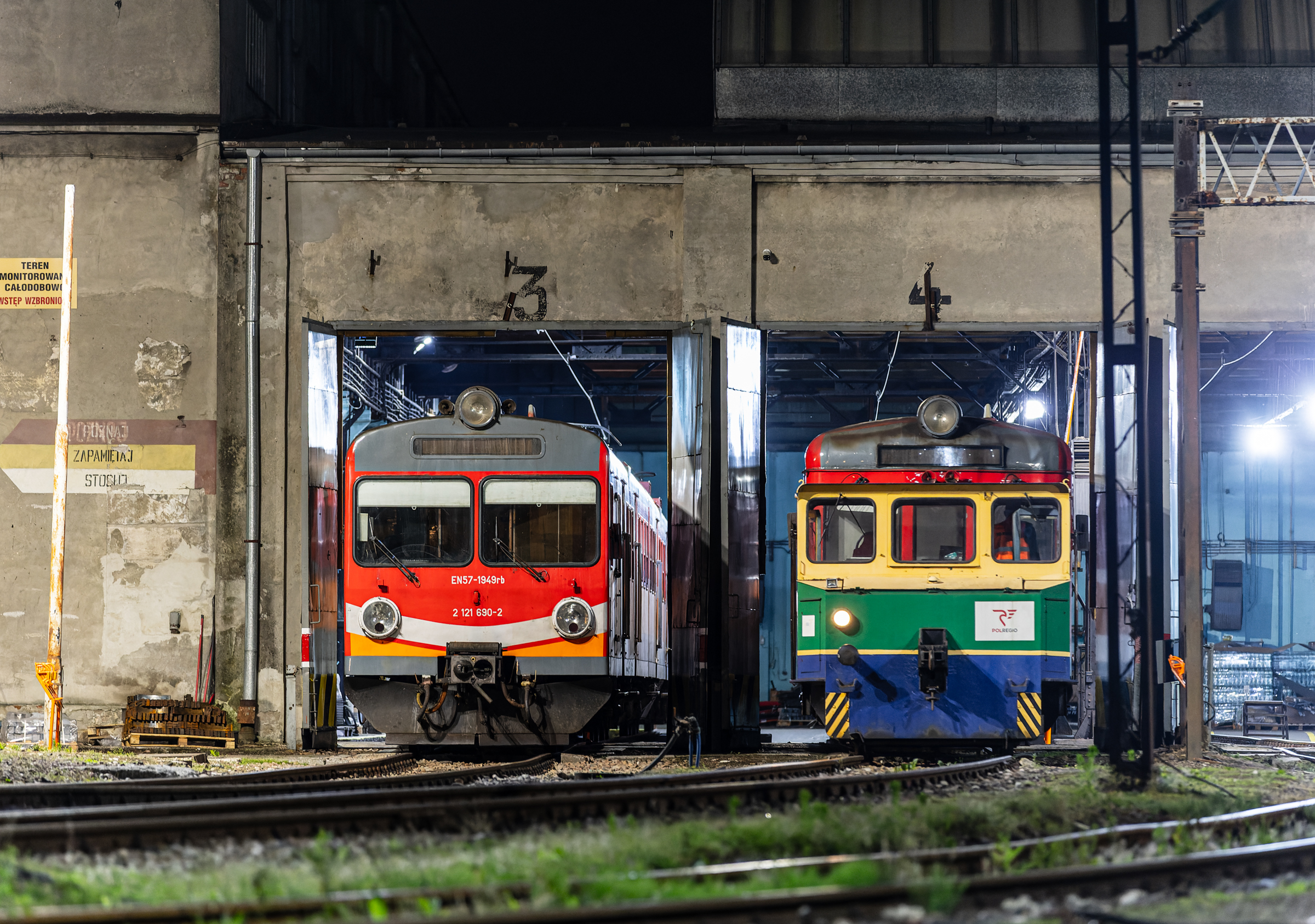 EN57-1949 stoi wygaszony na lokomotywowni Polregio Kraków Płaszów, obok niego wpychany jest kibel 1373 przez tzw "hitlerka"