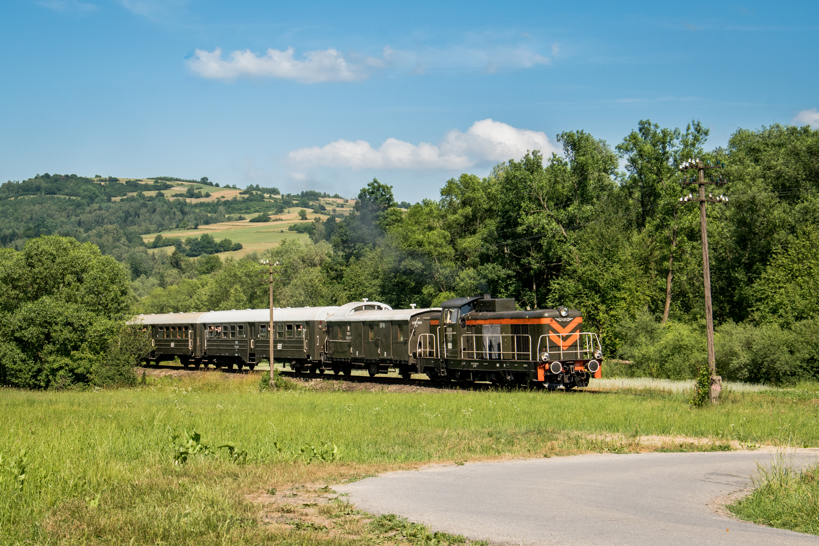 Oliwkowa SM42-1031 z inauguracyjnym pociągiem retro do Chabówki przemierza klimatyczną Galicjankę. Skład za parę chwil dojedzie do stacji Rabki Zaryte, gdzie zaliczy postój. W ten sposób Nowosądeckie Stowarzyszenie Miłośników Kolei zaczęło swój sezon 2022 w ramach Małopolskich Szlaków Turystyki Kolejowej. Dzień wcześniej tegoroczne przejazdy po 104-ce otworzył parowóz Ty42-107 z pociągiem do Kasiny Wielkiej.