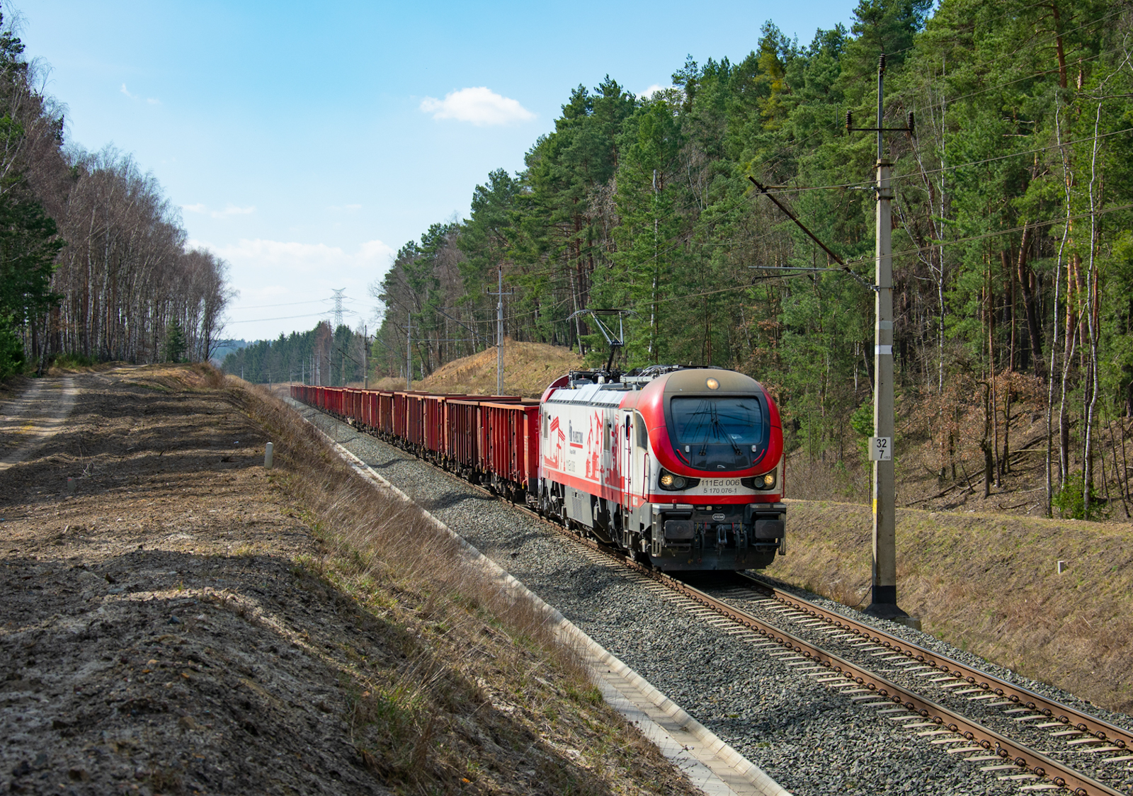 Gama w służbie Pol Miedź Trans z Rail Capital Partners z pociągiem towarowym nr 684023 rel. Legnica - Recław mija las na pograniczu Rynarcic i Juszowic jadąc w pogodne popołudnie szlakiem Koźlice - Rudna Gwizdanów w stronę Głogowa.