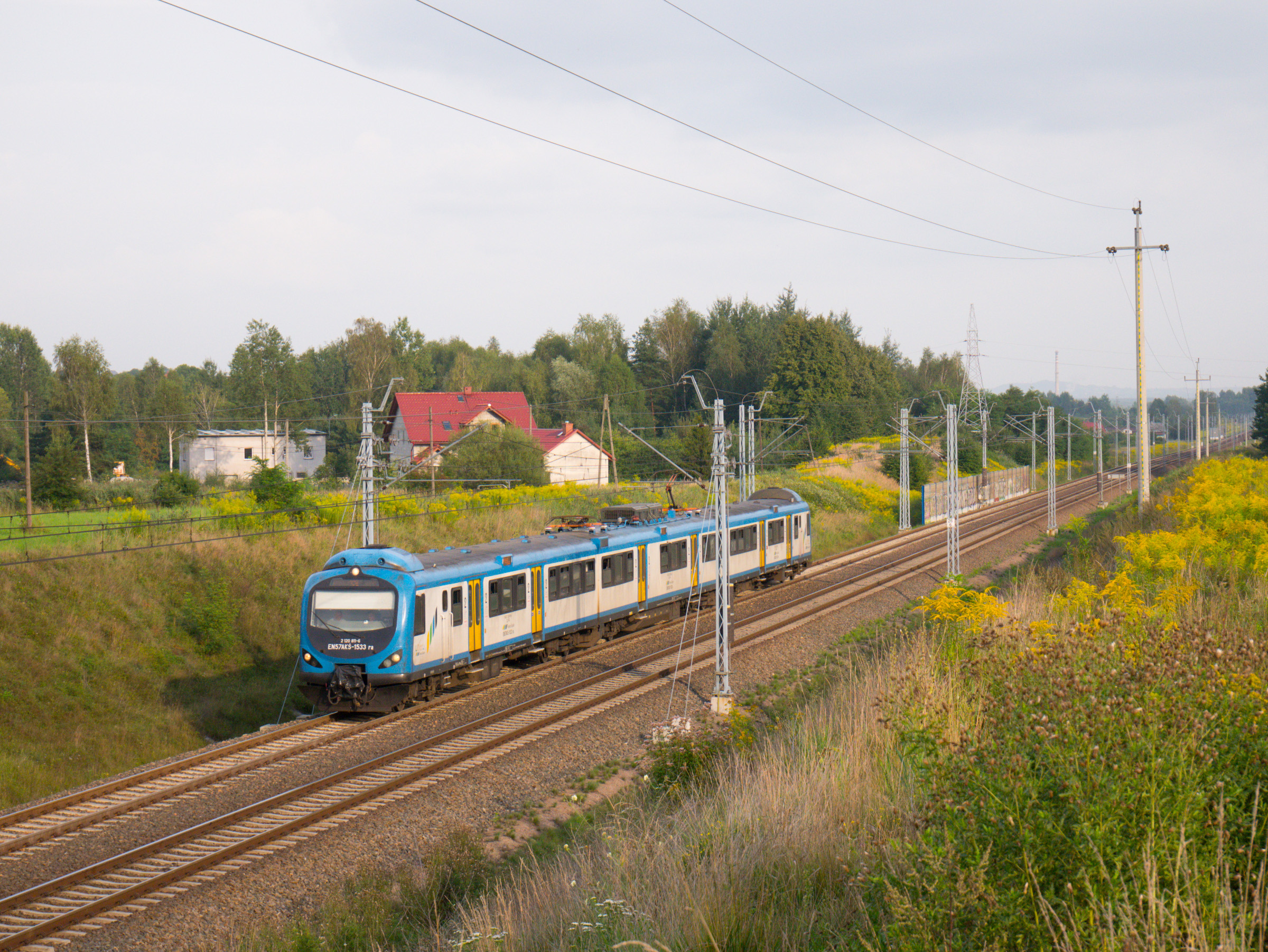 EN57AKŚ z popołudniowym kursem 43102 jedzie przez "wioskę".