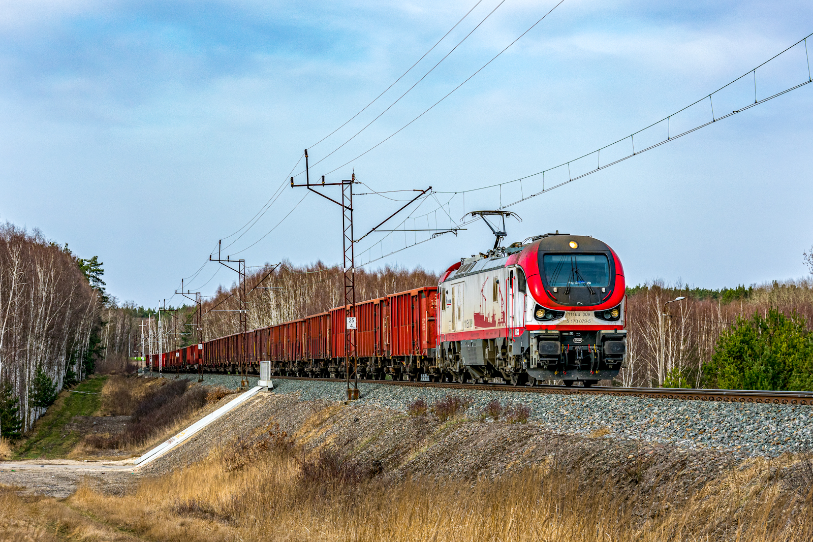 Gama w służbie Pol Miedź Transu z Rail Capital Partners z pociągiem towarowym nr 864040 rel. Recław - Legnica mija wiadukt nad drogą do miejscowego lotniska jadąc w pochmurne popołudnie szlakiem Koźlice - Lubin w stronę Legnicy.