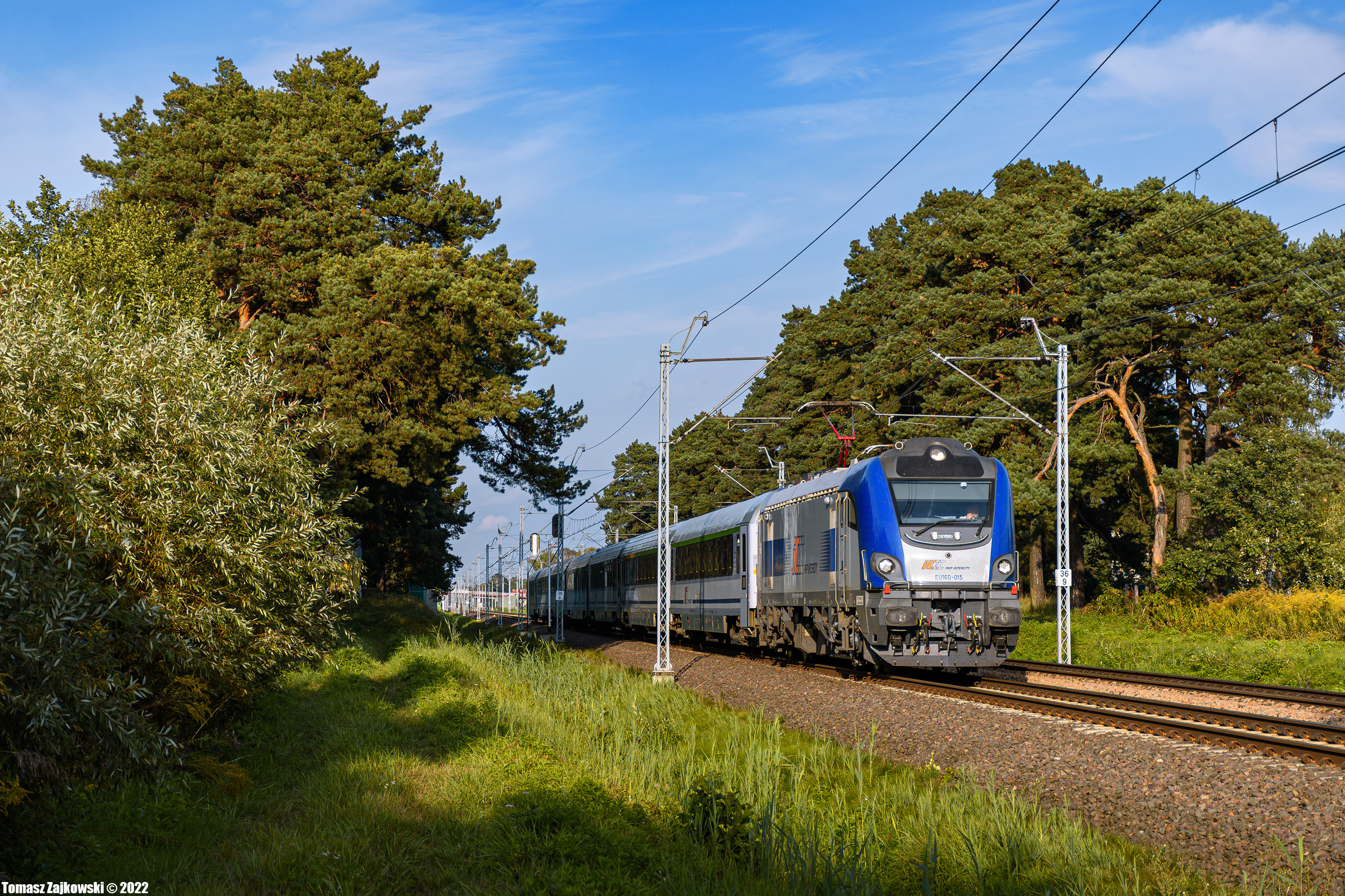 EU160-015 z IC "Kujawiak" z Chełma do Piły, mknie szlakiem Grodzisk Mazowiecki - Żyrardów.