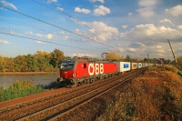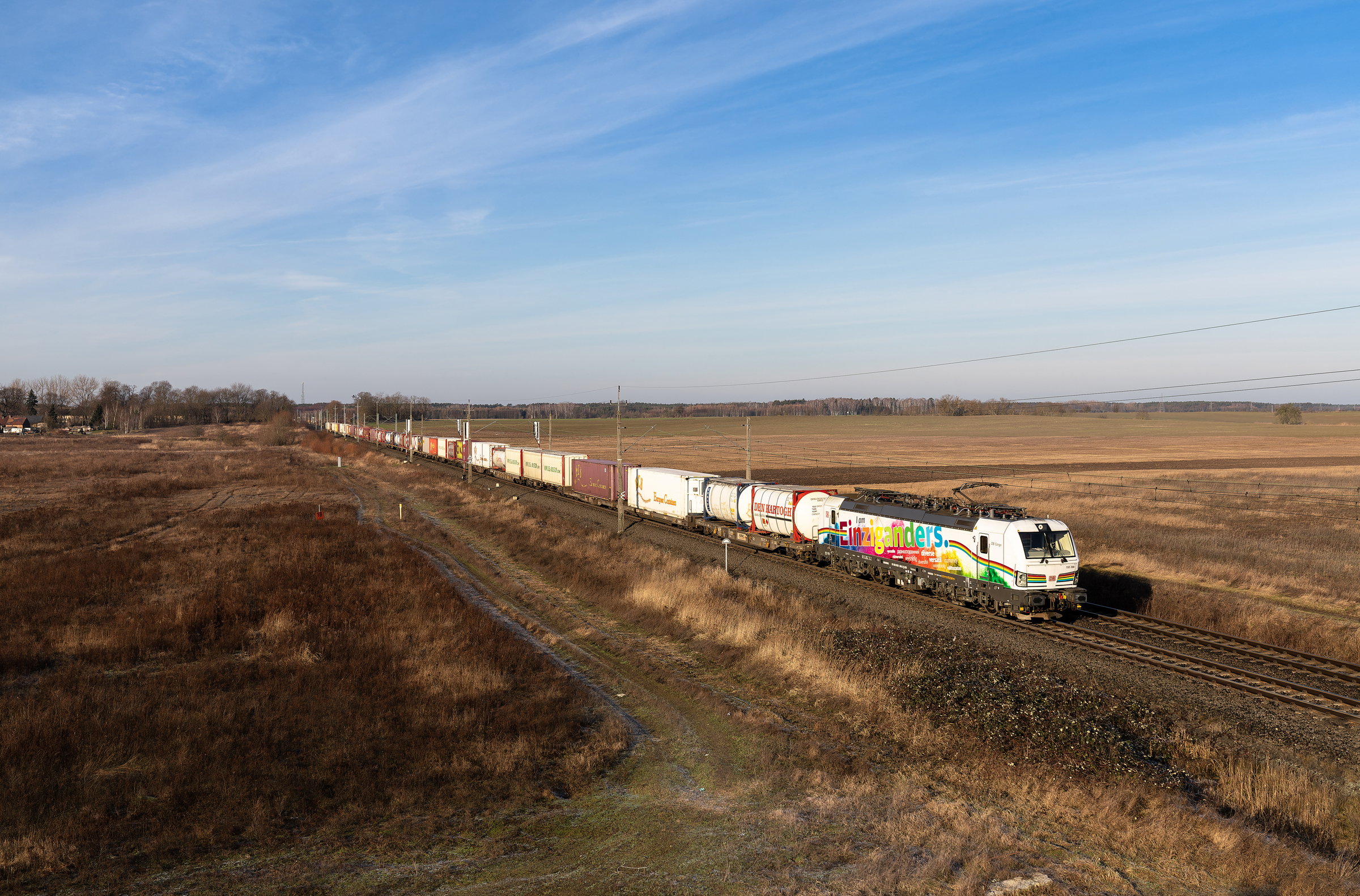 Propagandowy Vectron należący do DB Cargo wjeżdża do Rzepina pewnego słonecznego, ale jakże mroźnego poranka ze składem kontenerów z Antwerpii do Pruszkowa.