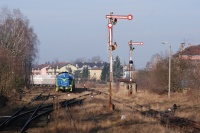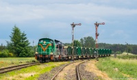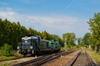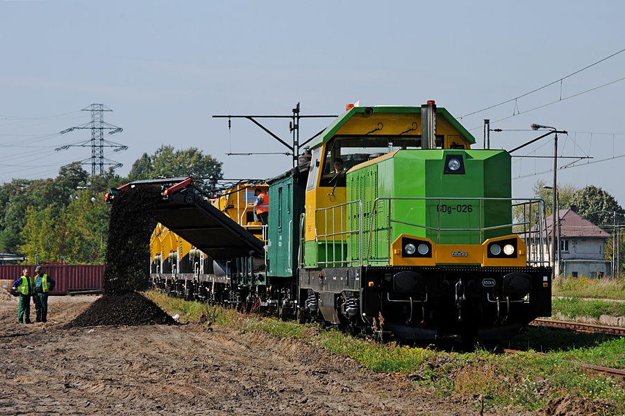 6Dg-026 należąca do Przedsiębiorstwa Napraw i Utrzymania Infrastruktury Kolejowej w Krakowie wraz ze składem roboczym podczas opróżniania na jednym z bocznych torów stacji.