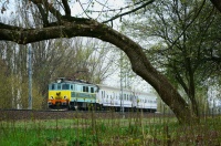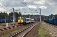 EP07-410 wraz z jadącą na zimno EP07-514, na czele pociągu IC "Korczak" z Warszawy do Łodzi, jadą szlakiem Grodzisk Mazowiecki - Żyrardów.