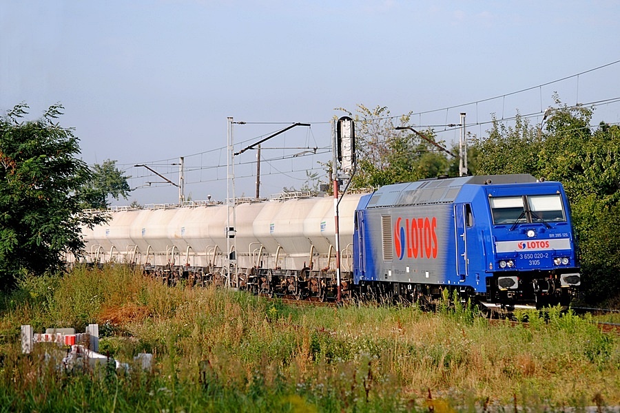 BR285-125 należący do LOTOS Kolej wraz ze składem pudernic z Gdańska Osowy do Ożarowa Cementowni minął przed chwilą semafor wjazdowy na stację Łódź Chojny.