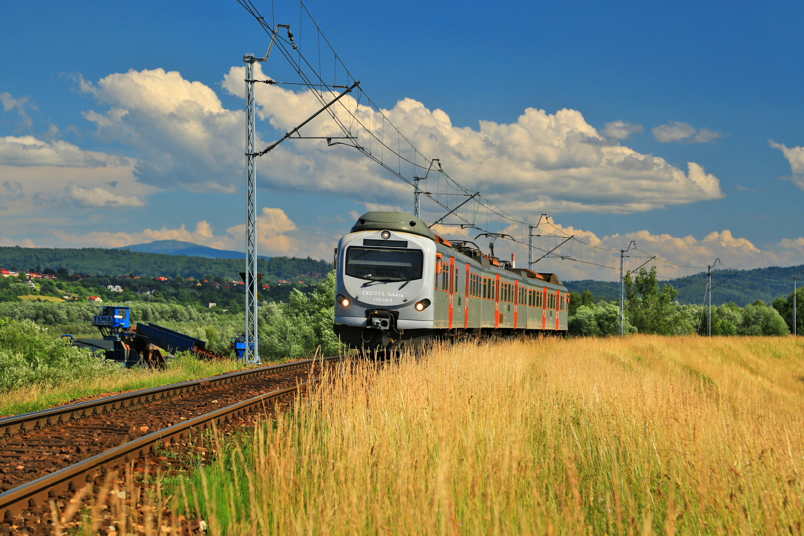 Jeden z kilku dzierżawionych "Feniksów" przez Koleje Śląskie jedzie do Katowic nasypem obok Jeziora Żywieckiego. Głęboko w tle widoczna Babia Góra 1725 m n.p.m.