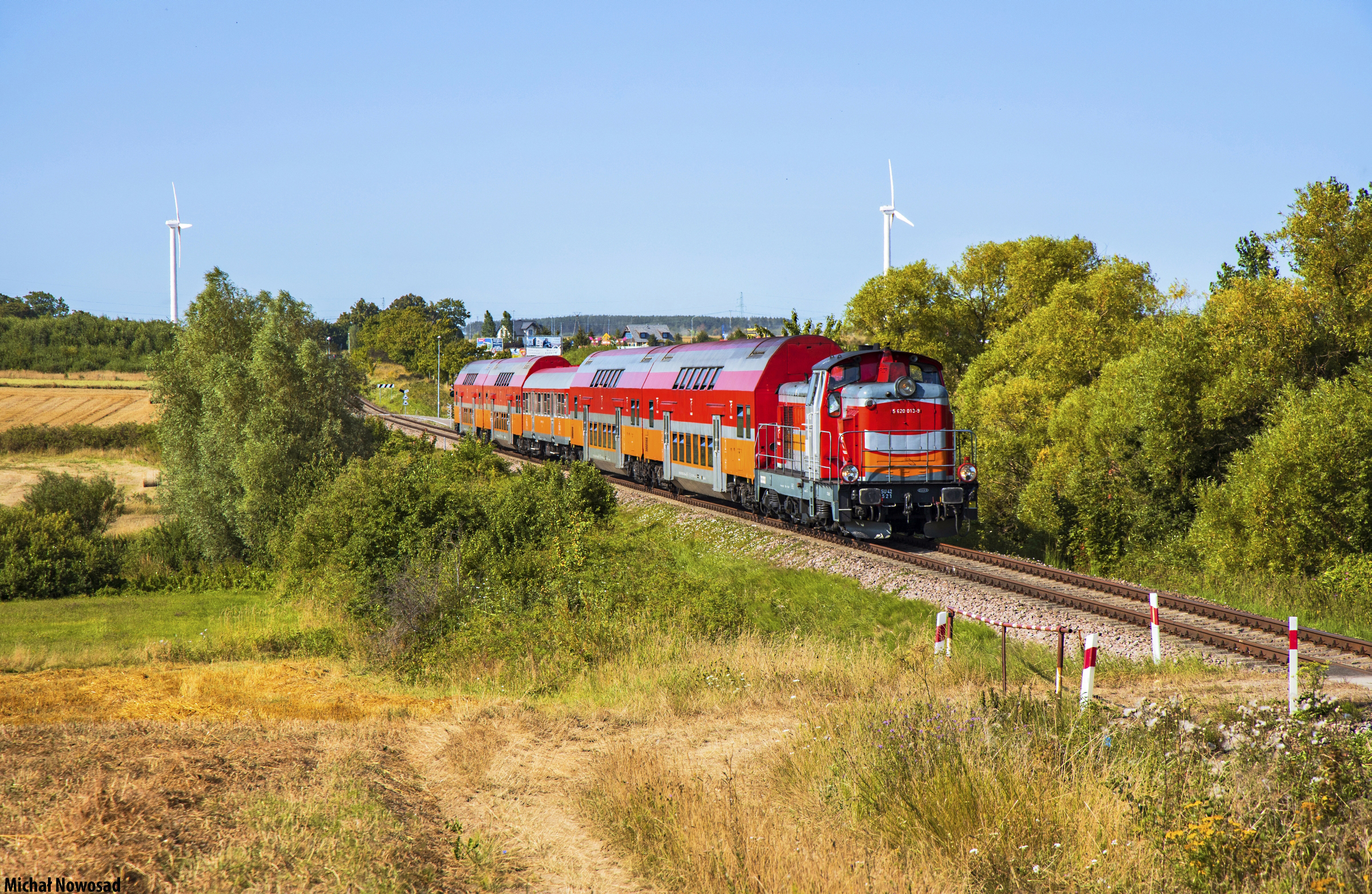 SU42-521 prowadzi pociąg Regio 90548 relacji: Hel - Gdynia Główna. Skład kilka minut temu odjechał z p.o. Swarzewo i zmierza w kierunku Pucka.