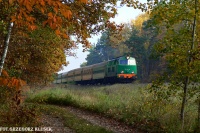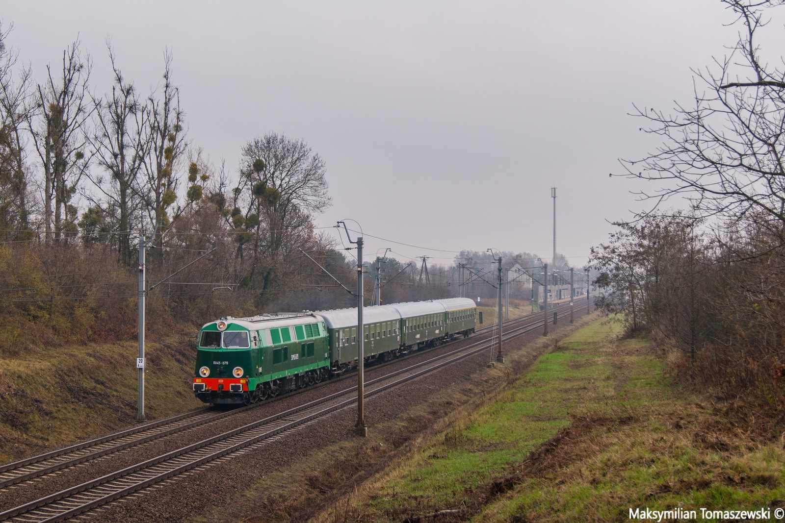 Fiat SU45-079 z pociągiem specjalnym "Badacz" relacji Wrocław Główny - Żmigród zorganizowanym przez Turkol minął właśnie widoczny w oddali przystanek Pęgów i zmierza w kierunku Obornik Śląskich. Przed kursem powrotnym skład zdążył wjechać na tor doświadczalny, na którym wykonał dwa okrążenia.
